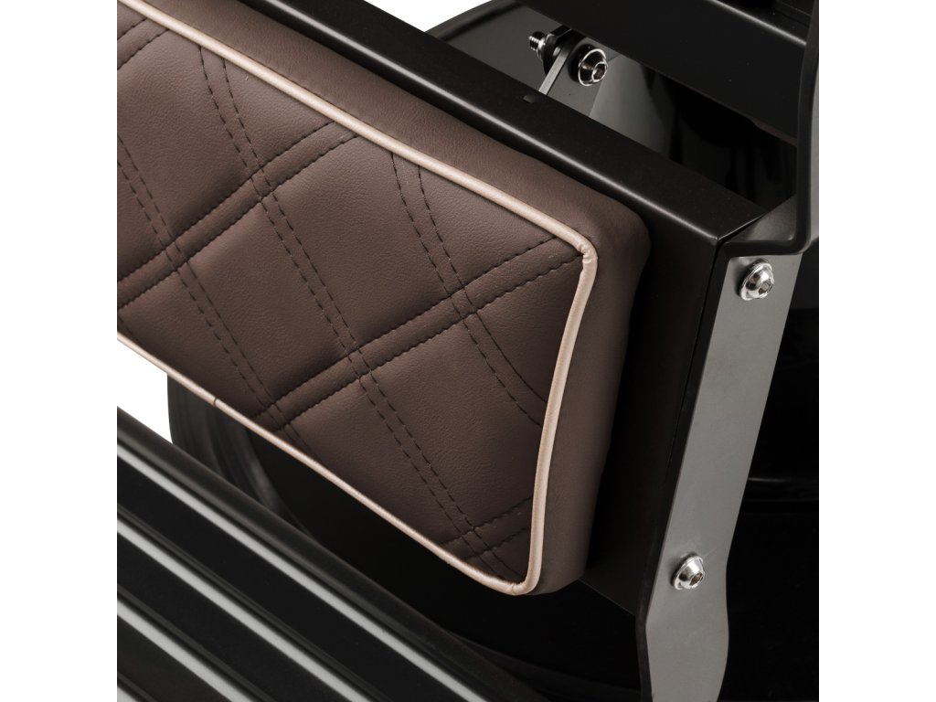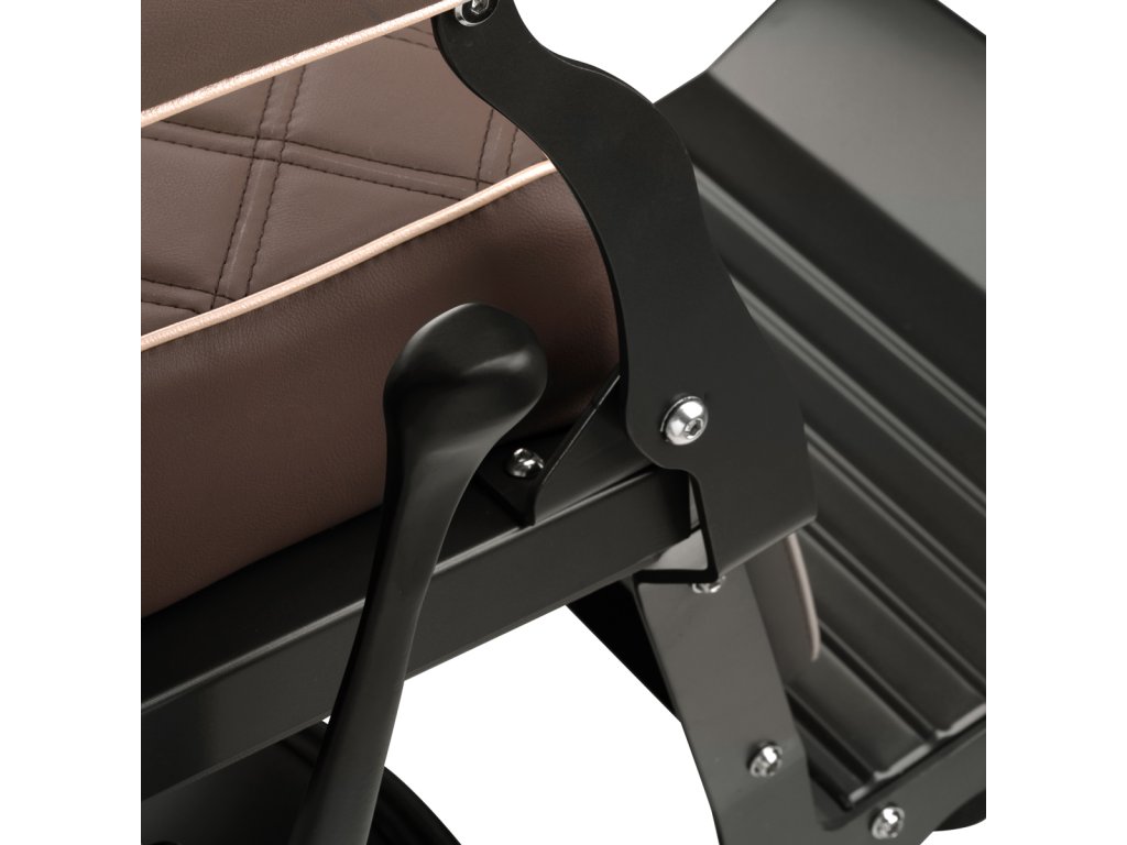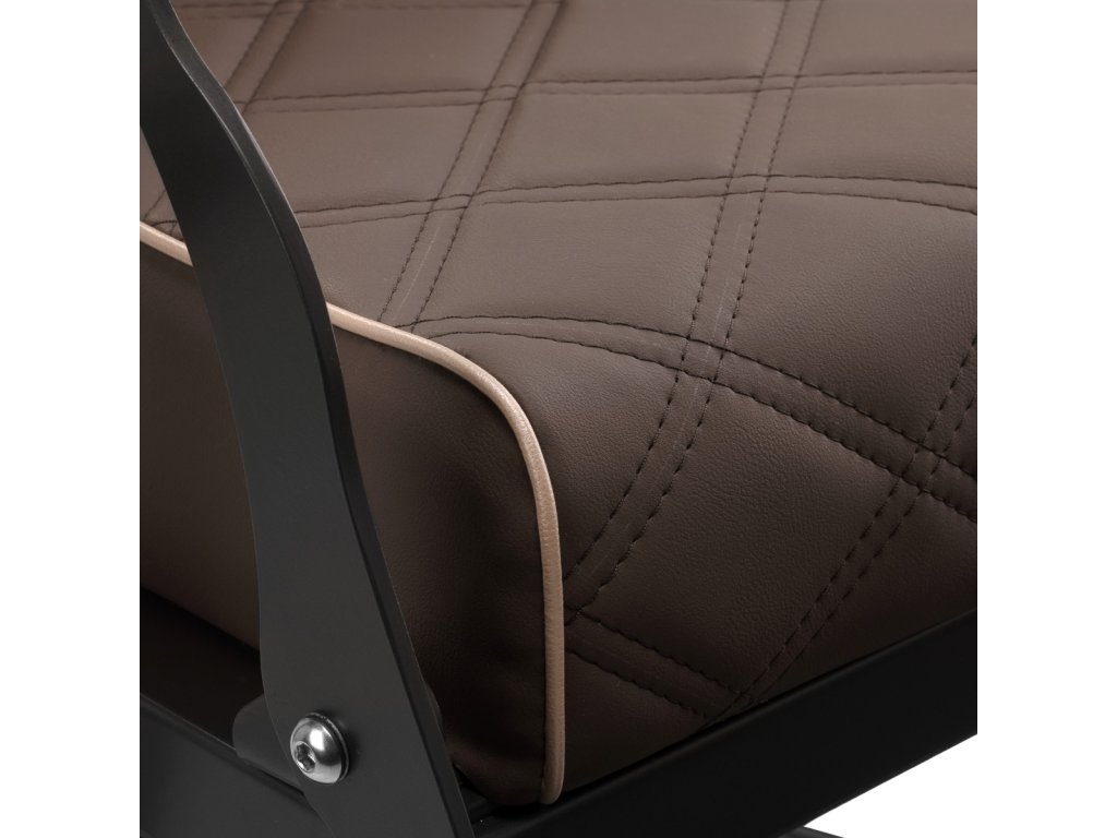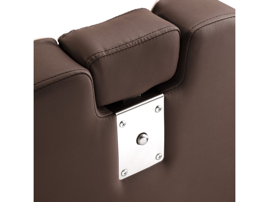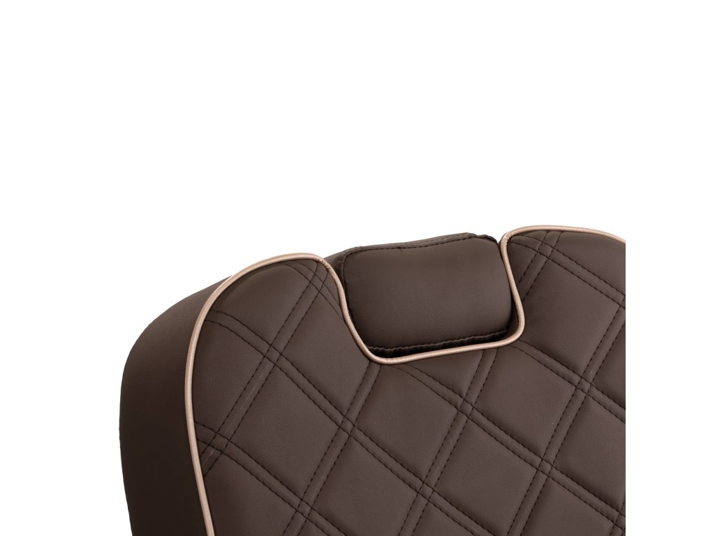 Az ergonomikus kialakítású ülőrész, a puha, párnázott karfák és a teljesen forgatható mechanizmus garantálják a maximális kényelmet a vendég és a kezelést végző számára is. A matt barna szintetikus bőr kárpitozás elegáns megjelenést kölcsönöz, miközben strapabíró, vízálló és könnyen tisztítható.