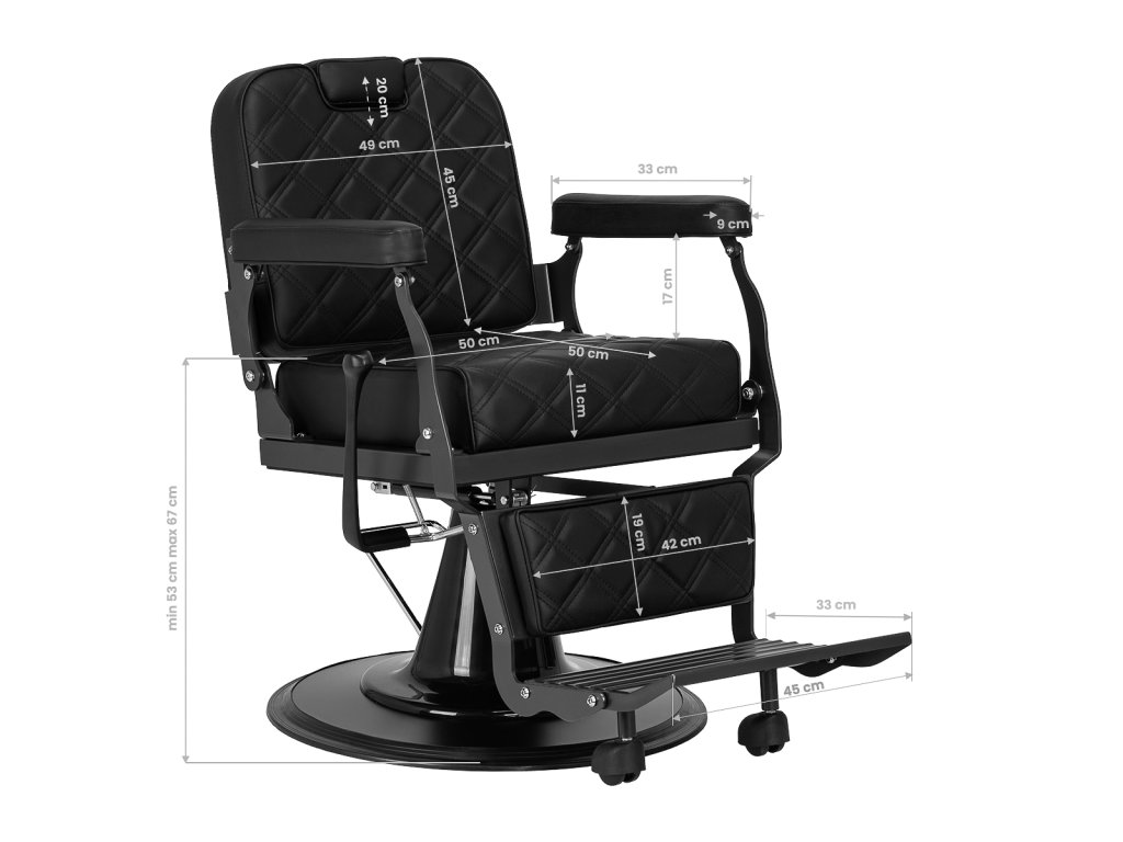 Az ülés magassága 56 és 70 cm között állítható, a 25 cm-rel kihúzható fejtámla pedig kiváló alátámasztást nyújt minden testmagassághoz. A dönthető háttámla és állítható lábtámasz segítségével a szék akár félig fekvő pozícióba is dönthető, így tökéletesen alkalmazkodik borotválás, hajmosás vagy más szolgáltatások igényeihez.
