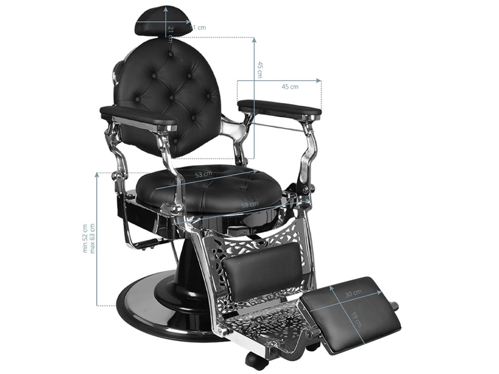 Ez a vintage stílusú barber szék nemcsak dekoratív, de rendkívül funkcionális is. A hidraulikus emelő segítségével az ülésmagasság 54–67 cm között állítható, még akkor is, ha a vendég a székben ül. A dönthető háttámla és az állítható lábtartó lehetővé teszi a kényelmes, félig fekvő pozíciót, ideális borotváláshoz vagy hajmosáshoz. A fejtámla akár 20 cm-rel meghosszabbítható, így minden vendég igényeihez könnyen igazítható.