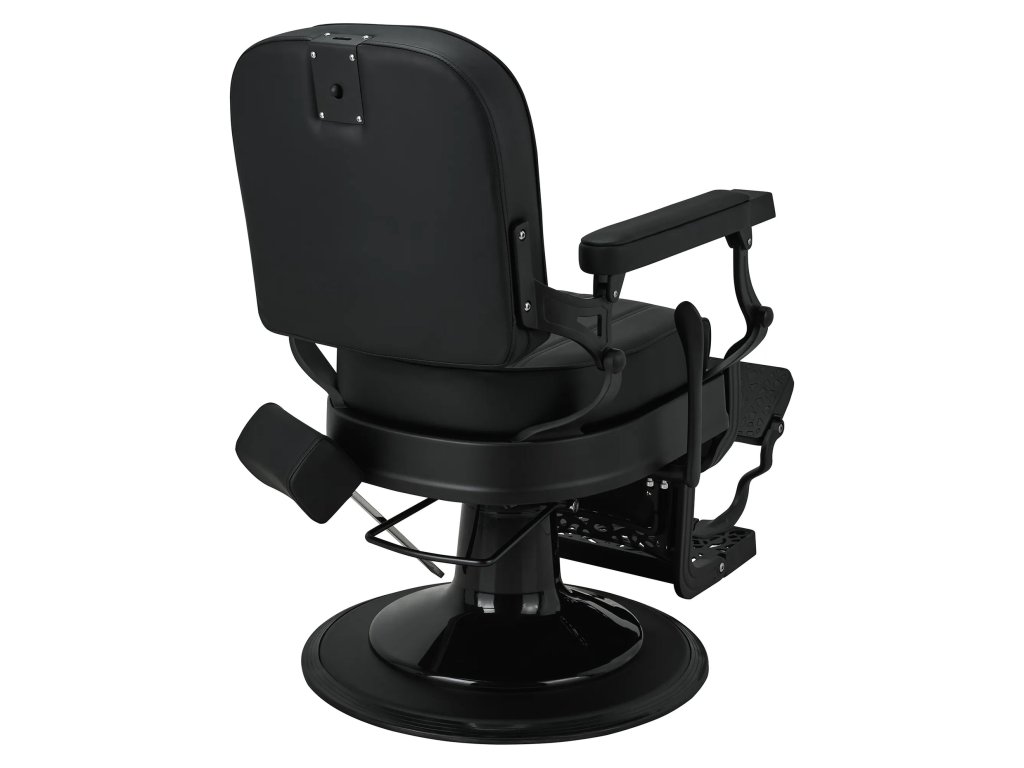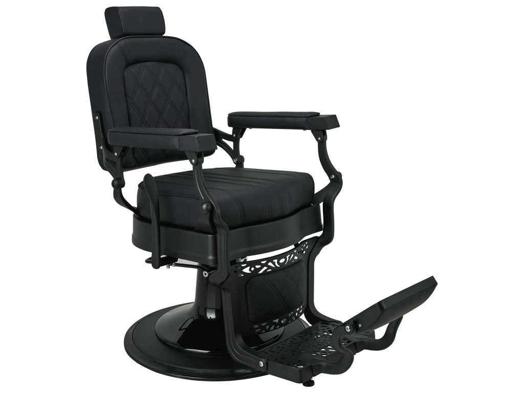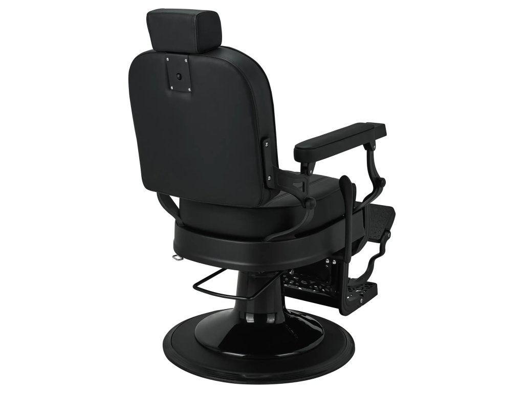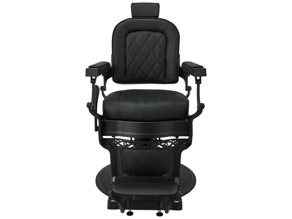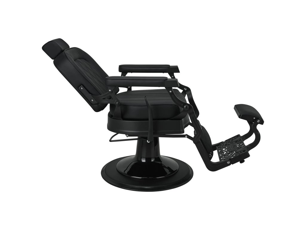 A matt fekete kárpitozás elegáns dísztűzéssel kombinálva, valamint a szaténfekete fémszerkezet időtlen, luxus megjelenést biztosít. A széles, párnázott ülés, az állítható fejtámla, a dönthető háttámla és a forgatható, párnázott lábtartó a vendég kényelmét szolgálják, míg a barber számára ergonomikus hozzáférést garantálnak minden szolgáltatás során.
