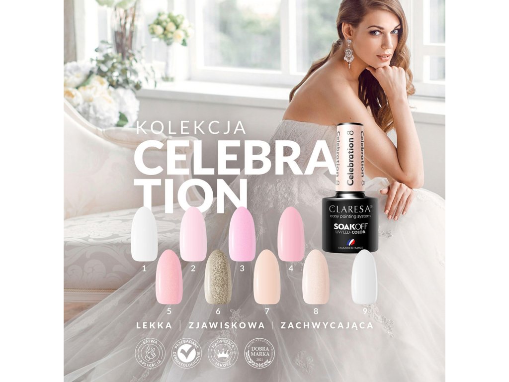 A CELEBRATION kollekció megbízható fedést, könnyű felvitelt és tartós, ragyogó eredményt biztosít. A körömlakk UV/LED lámpában gyorsan köt, így tökéletes választás bármilyen kozmetikai szalon számára.