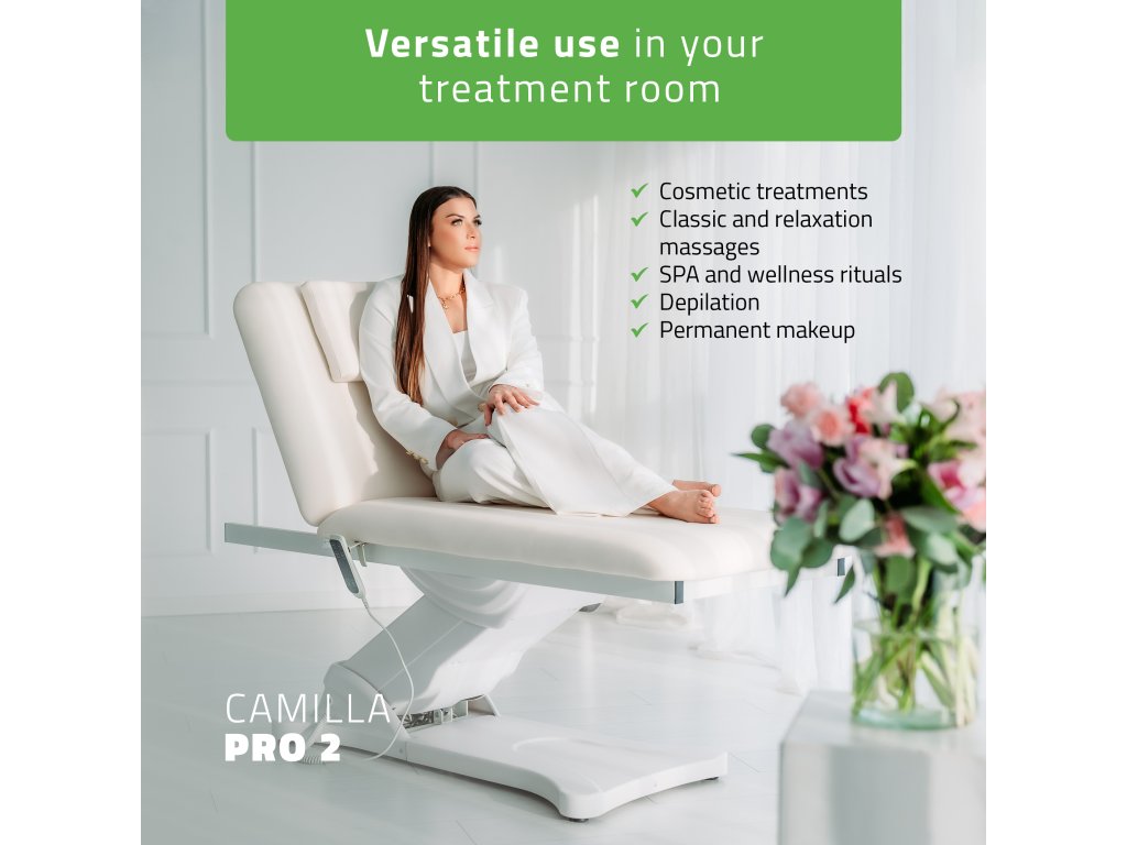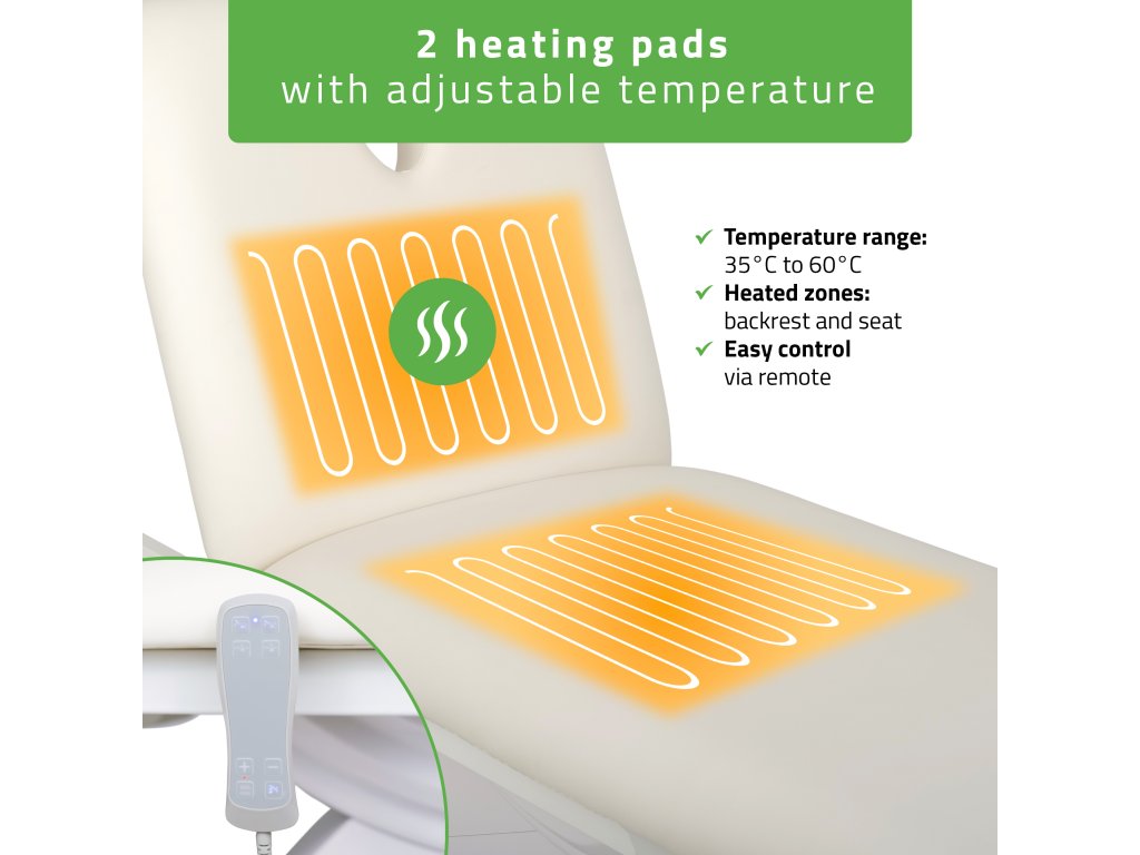 A kétmotoros rendszer lehetővé teszi a magasság (56–80 cm) és a dőlésszög pontos beállítását, míg a beépített fűtés (35–60 °C) gondoskodik a vendég maximális komfortjáról. A 8,5 cm vastag párnázás tökéletes alátámasztást nyújt, így a kezelések akár hosszabb időn át is kényelmesek.
