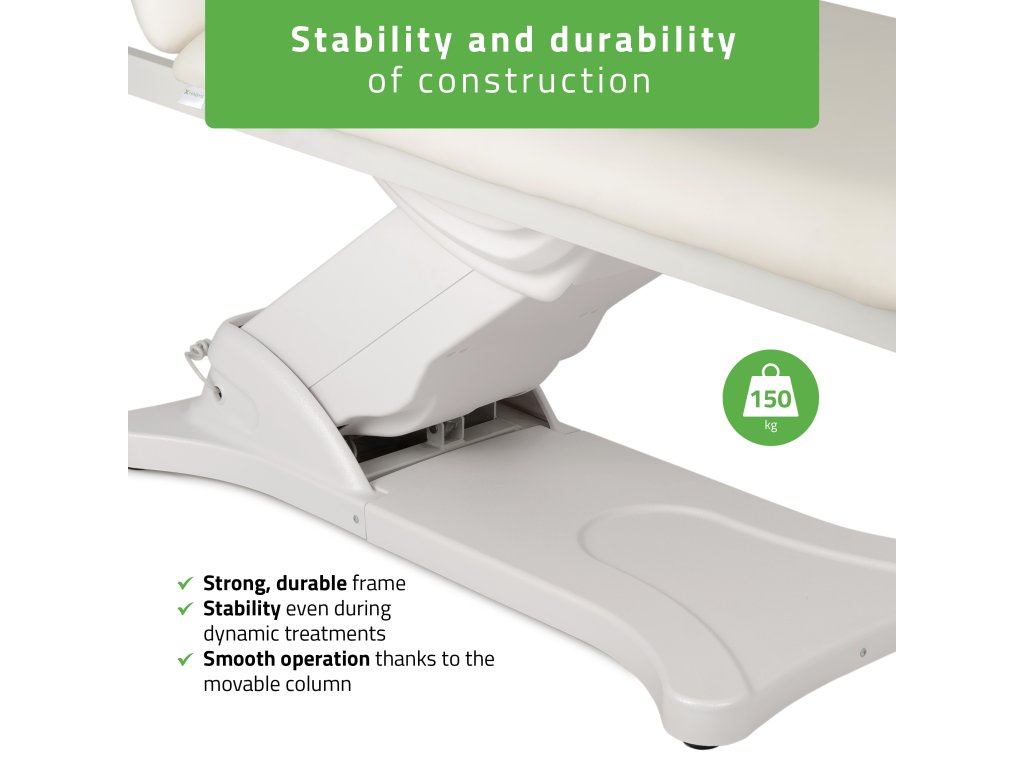 A masszázságy stabil, robusztus szerkezete és a csendes emelős oszlopmechanizmus biztosítja a megbízható működést a mindennapi intenzív használat során. A keskenyített alap kialakításának köszönhetően a terapeuta könnyebben fér hozzá a vendéghez felülről, ami ergonomikusabb munkavégzést tesz lehetővé.