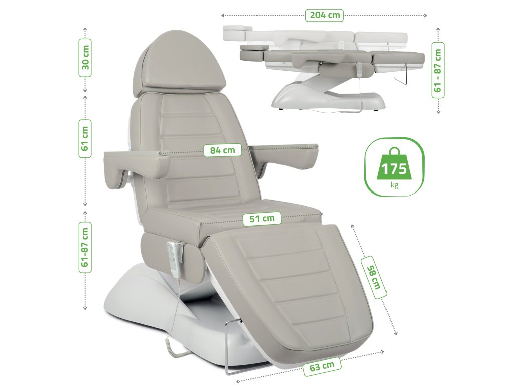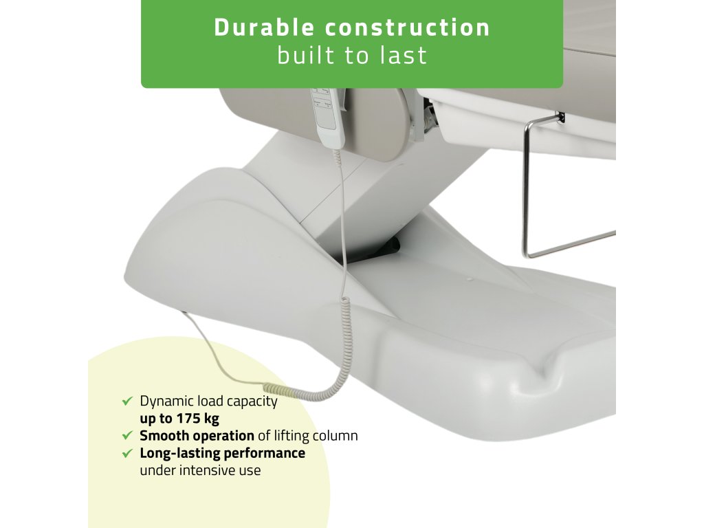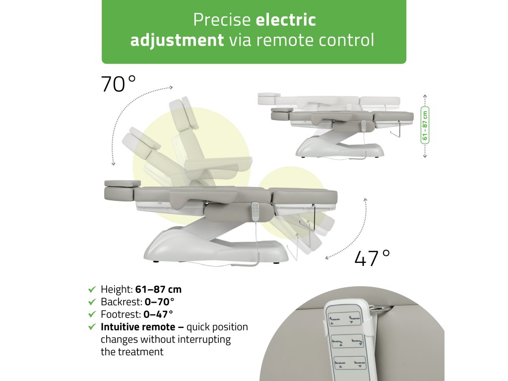 Az elektromos kozmetikai ágy COMFY PRO 522 a modern technológia, a kényelem és az elegáns dizájn tökéletes kombinációja. Három erős elektromotorral van felszerelve, amelyek lehetővé teszik a magasság (61–87 cm), a háttámla (0–70°) és a lábtartó (0–47°) precíz beállítását. Az összes funkció kényelmesen vezérelhető az intuitív kézi távvezérlő segítségével, így a kezelést nem kell megszakítani a pozíció módosításához.