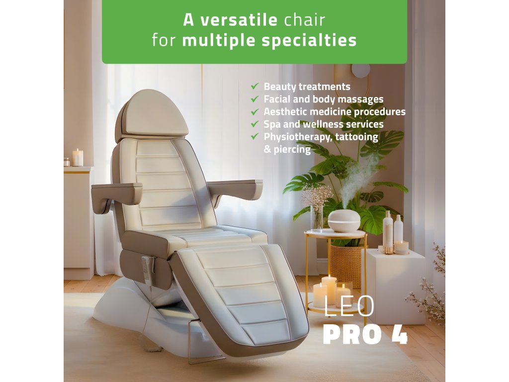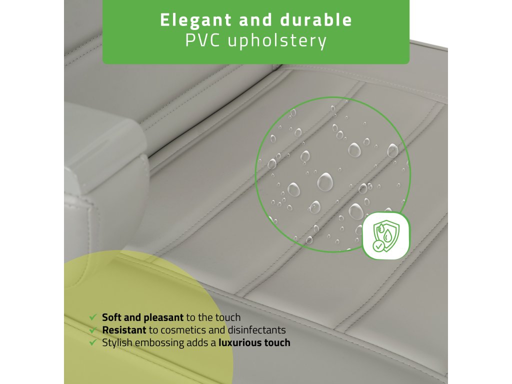 Az elegáns fa díszítések és a dekoratív varrások modern, prémium megjelenést kölcsönöznek az ágynak, amely tökéletesen illeszkedik a kozmetikai szalonok, spa és wellness központok, masszázs- és tetováló stúdiók enteriőrjébe.