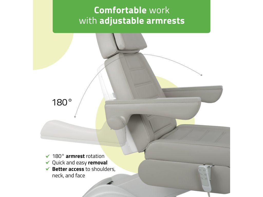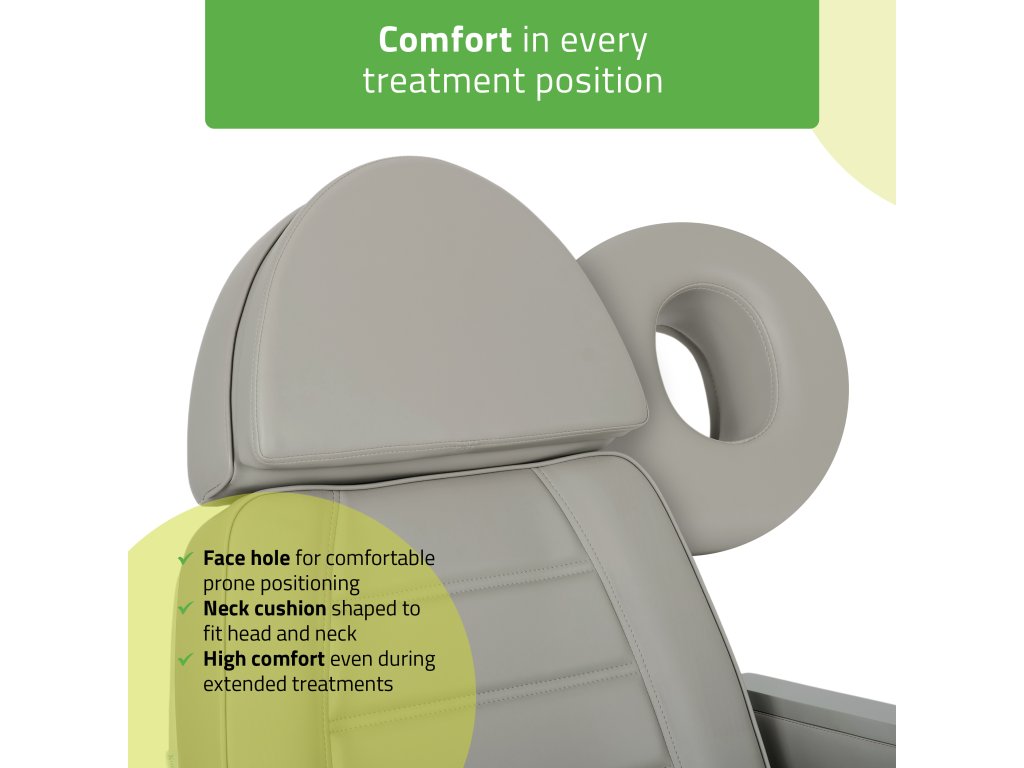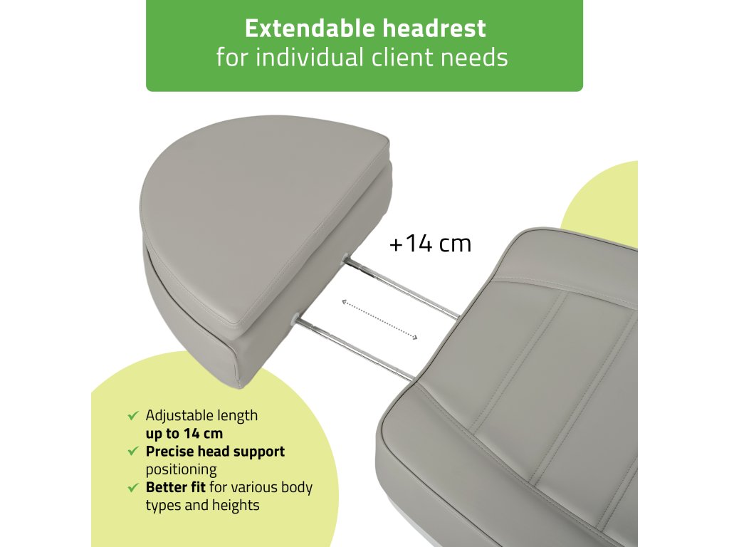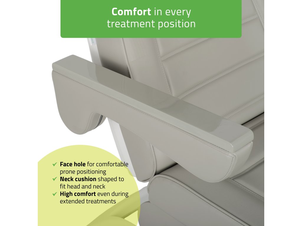 A vendég kényelmét tovább növeli a 14 cm-rel meghosszabbítható, arckivágással ellátott és párnázott fejtámla. A levehető és 180°-ban elforgatható kartámaszok rugalmasan igazíthatók a különböző kezelésekhez, vagy akár teljesen eltávolíthatók a jobb hozzáférés érdekében.