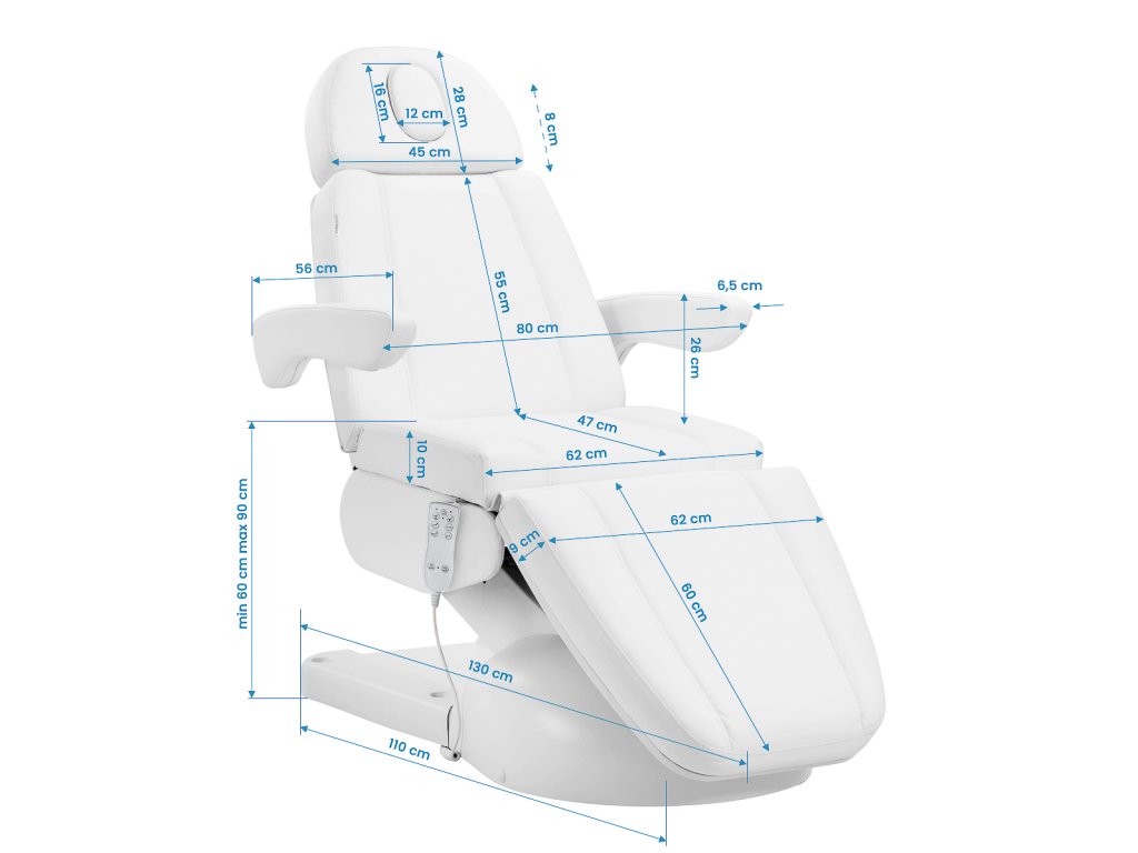 A három halk motor lehetővé teszi a magasság, a háttámla és a lábtartó fokozatmentes elektromos beállítását a praktikus kézi vezérlő segítségével. A széles mozgástartománynak köszönhetően a vendég testhelyzete könnyen igazítható a kezelés típusához és az egyéni igényekhez.