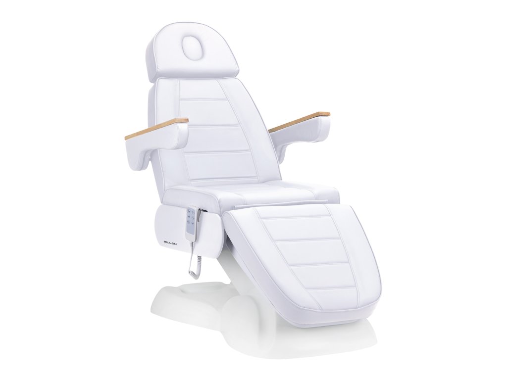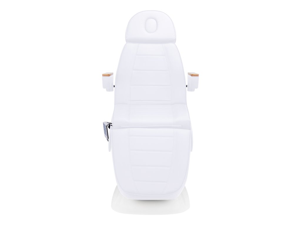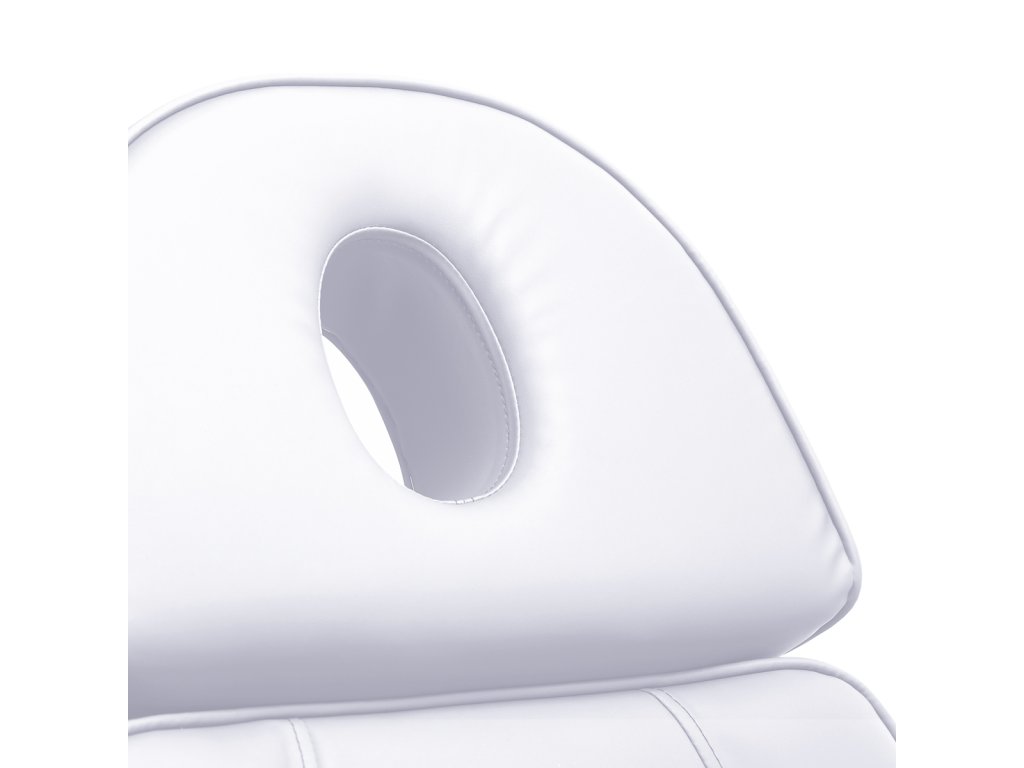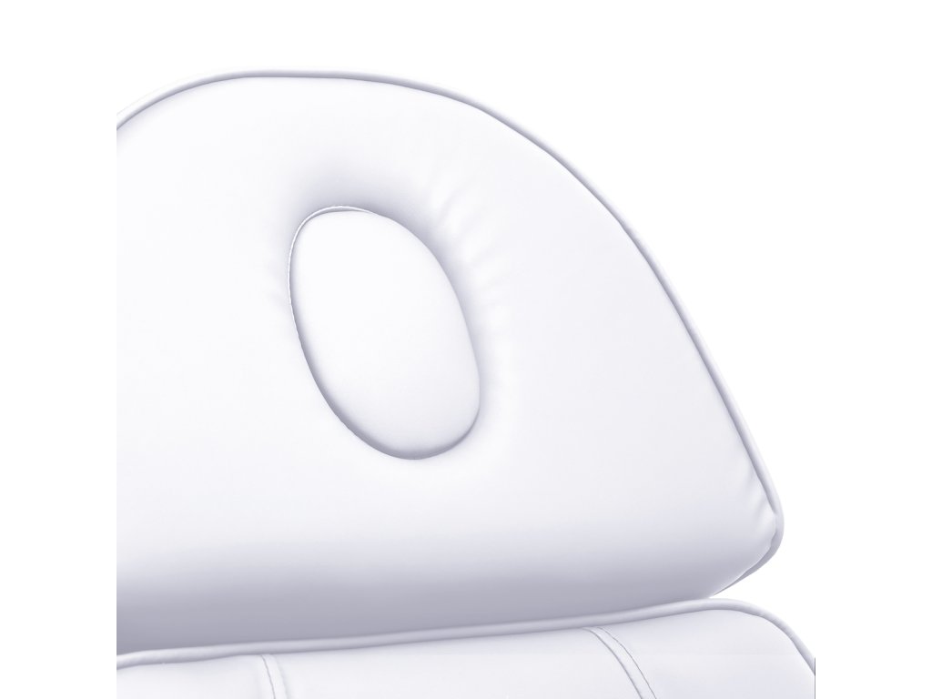 A széles ülőfelület, a tartós habszivacs töltet és a szintetikus bőr kárpitozás hideg fehér színben maximális kényelmet biztosítanak még hosszabb eljárások alatt is. A forgatható és levehető kartámaszok megkönnyítik a beszállást, és nagyobb hozzáférést biztosítanak a szakembernek. A kihúzható fejtámla és a teljesen vízszintes helyzetbe állítható ágy univerzálisan használható – arckezeléshez, testkezeléshez, fizioterápiához vagy akár tetováláshoz is.
