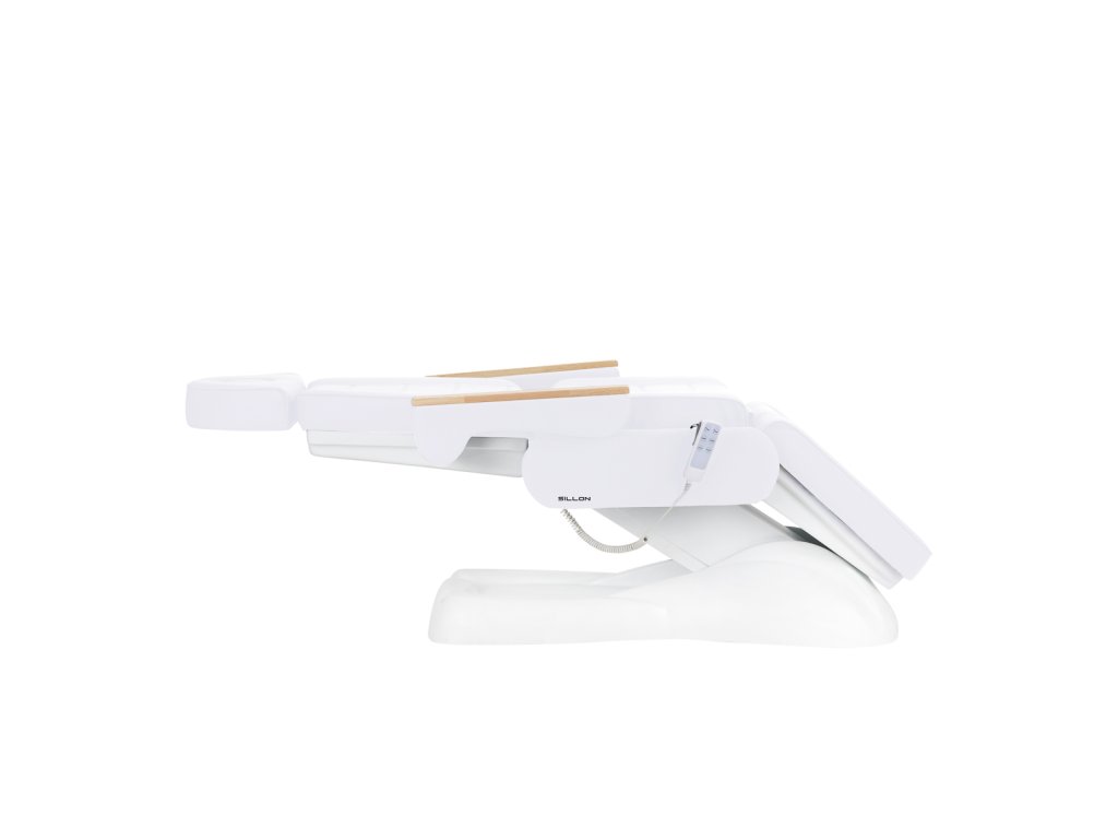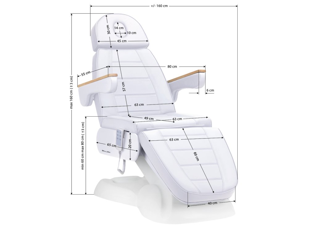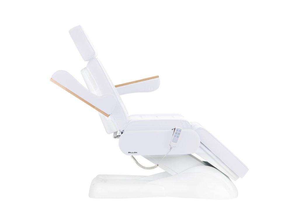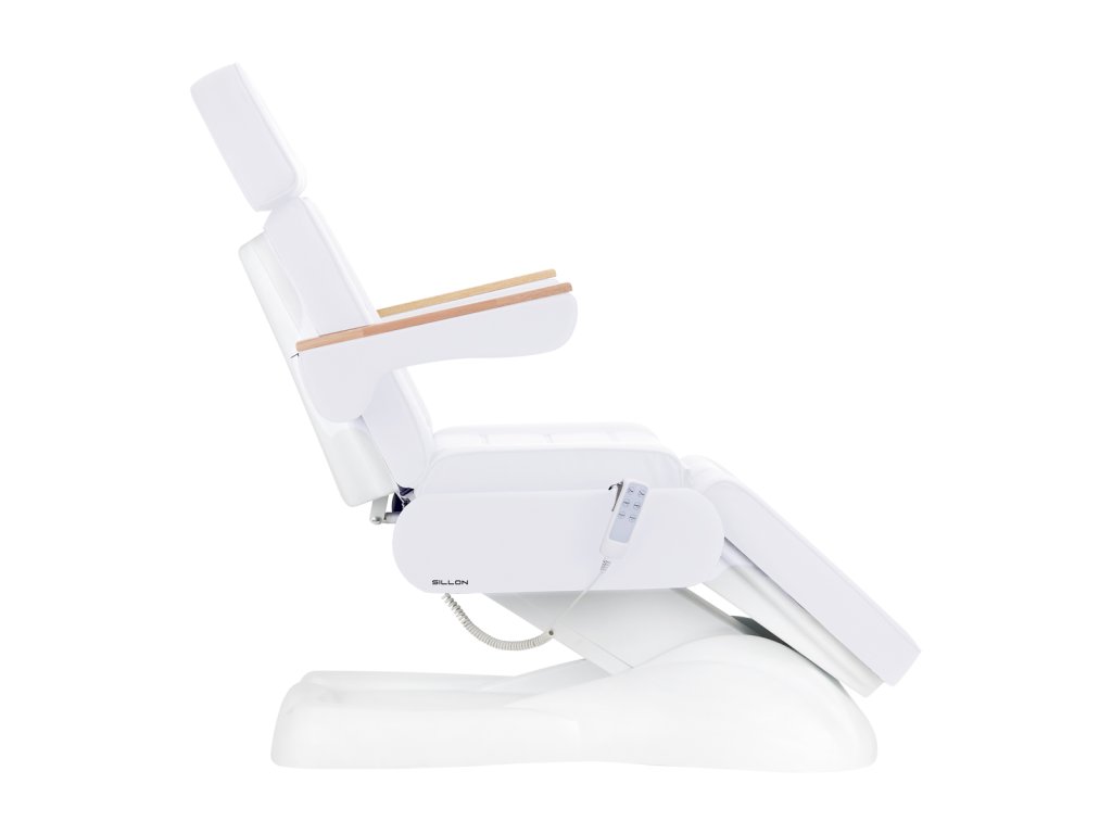 A széles ülőfelület, a tartós habszivacs töltet és a szintetikus bőr kárpitozás hideg fehér színben maximális kényelmet biztosítanak még hosszabb eljárások alatt is. A forgatható és levehető kartámaszok megkönnyítik a beszállást, és nagyobb hozzáférést biztosítanak a szakembernek. A kihúzható fejtámla és a teljesen vízszintes helyzetbe állítható ágy univerzálisan használható – arckezeléshez, testkezeléshez, fizioterápiához vagy akár tetováláshoz is.