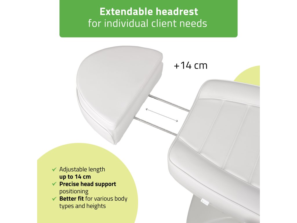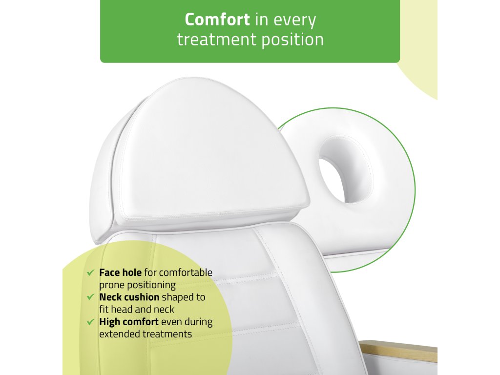 A teljesen vízszintes fekvő pozíció lehetővé teszi az arckezeléseket, masszázst vagy pihentető wellness szolgáltatásokat. A kihúzható fejtámla arcnyílással akár 14 cm-rel is meghosszabbítható, a mellékelt puha párna pedig kényelmet nyújt hason vagy oldalt fekve is.