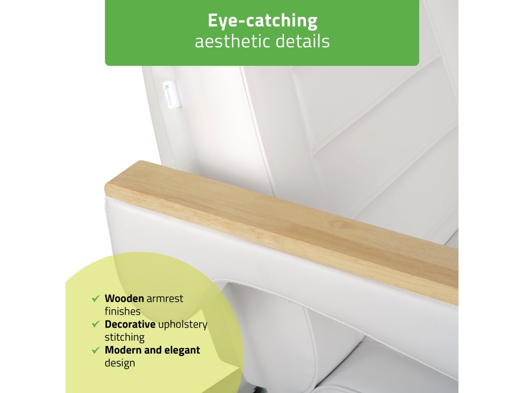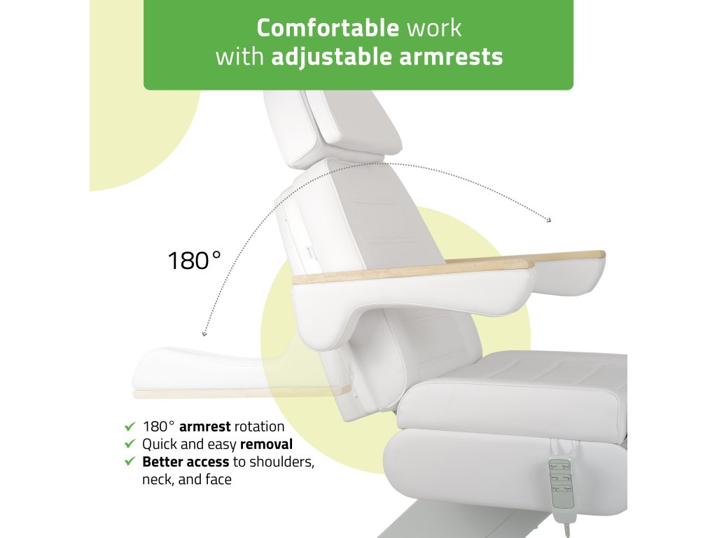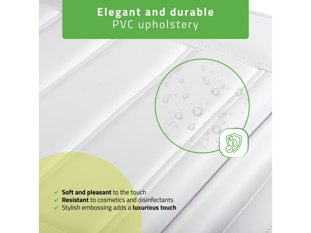 Az levehető és elforgatható kartámaszok megkönnyítik a hozzáférést a vendég testéhez. A PVC kárpitozás higiénikus, könnyen tisztítható, és a letisztult dizájn professzionális megjelenést biztosít.