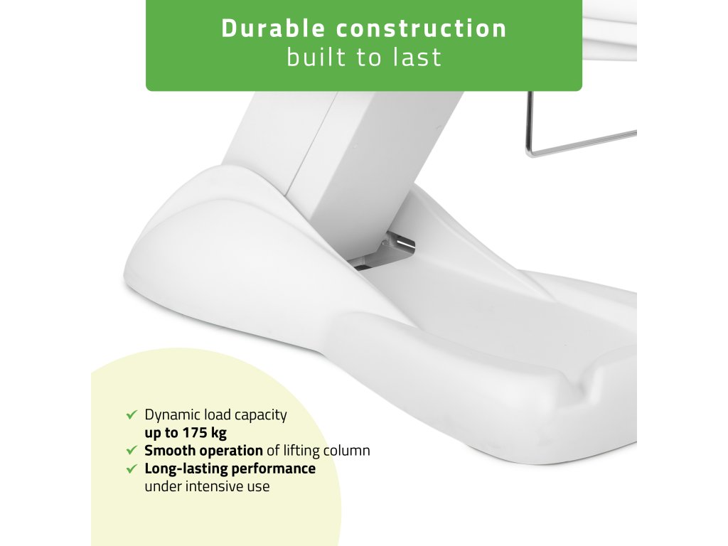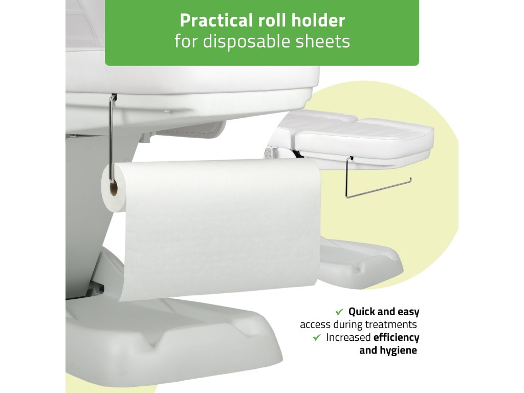 Az ágy stabil fémvázzal rendelkezik, teherbírása akár 175 kg, és papírlepedő tartóval van felszerelve a higiénikus munkavégzés érdekében.