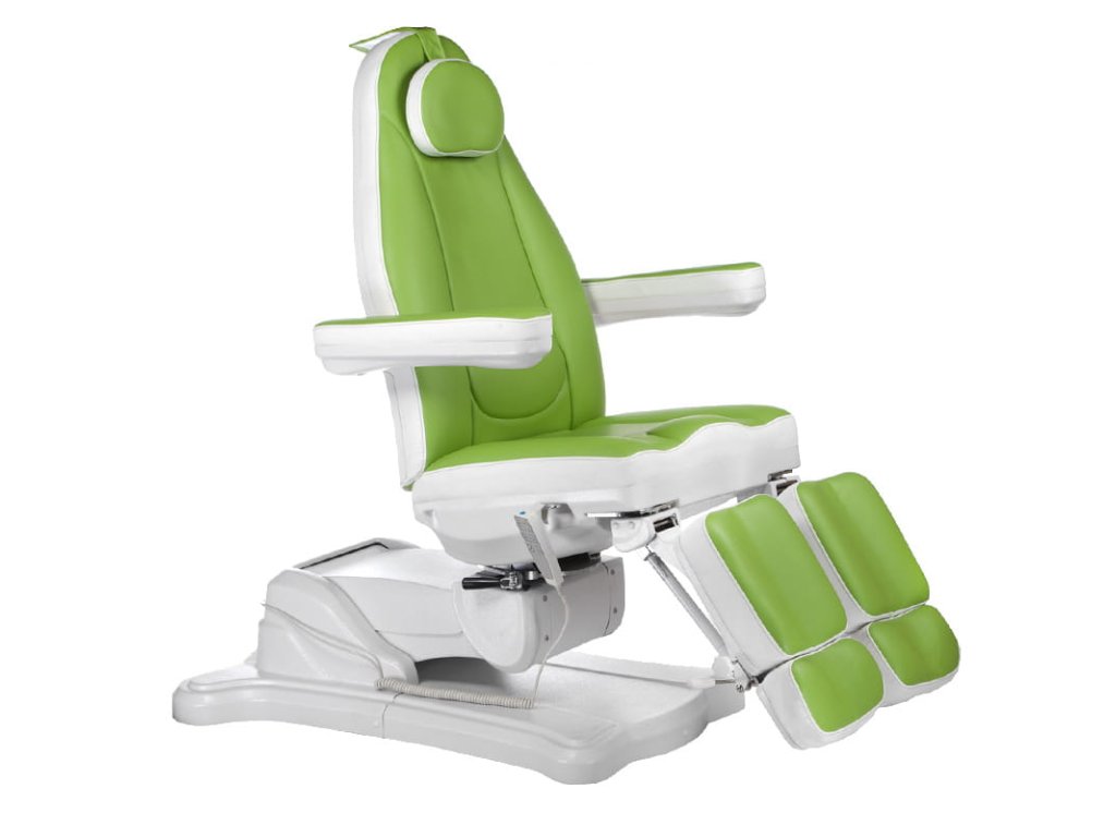A három motoros rendszer lehetővé teszi a szék magasságának, a háttámla dőlésszögének, valamint a bölcsőpozíció elektromos állítását. A kézi vezérlésű lábtartók oldalra is elfordíthatók 90°-ban, ami különösen praktikus pedikűrkezelések során. A kartámaszok levehetők, így a szék könnyen testreszabható az elvégzendő kezelés típusához.