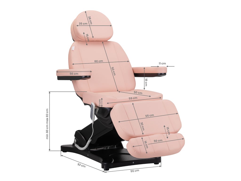 A kihúzható fejtámasz és állítható lábtartó segít a kezelések még kényelmesebb és testreszabottabb elvégzésében. A kartámaszok 180 fokban elfordíthatók vagy teljesen eltávolíthatók, így könnyebb a hozzáférés a vendéghez. Az ergonomikus ülésformázás biztosítja a kényelmes testhelyzetet és a megfelelő gerinctámaszt még hosszabb kezelések során is.