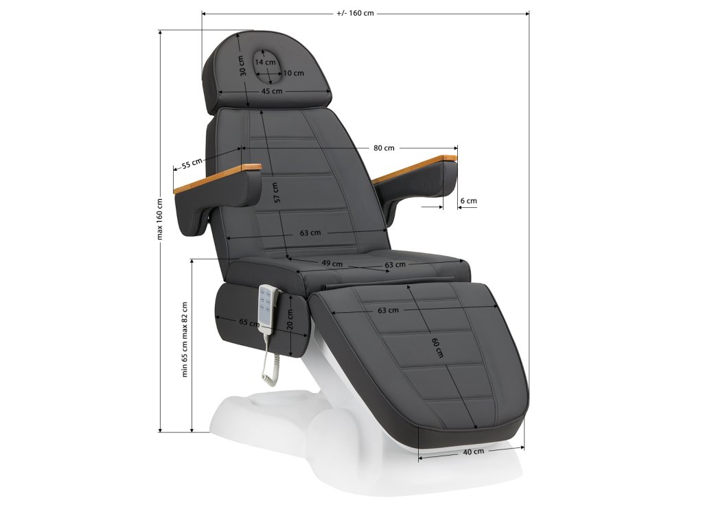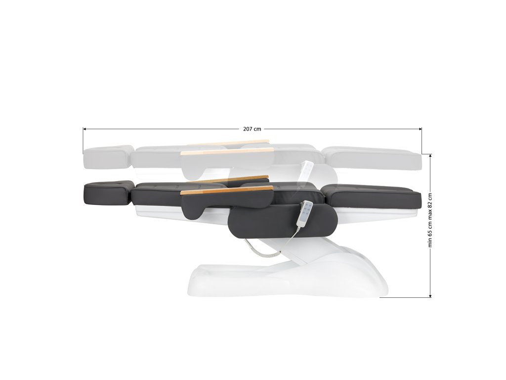 A szék ülésmagassága 65 és 84 cm között szabadon állítható, teljesen kinyitva pedig hossza meghaladja a 200 cm-t. Ezek a paraméterek lehetővé teszik, hogy a szék kényelmesen használható legyen különböző testmagasságú vendégek számára, valamint ergonómikus testhelyzetet biztosítson bármilyen kezelés során.
