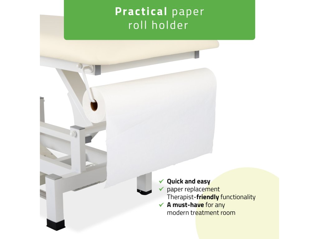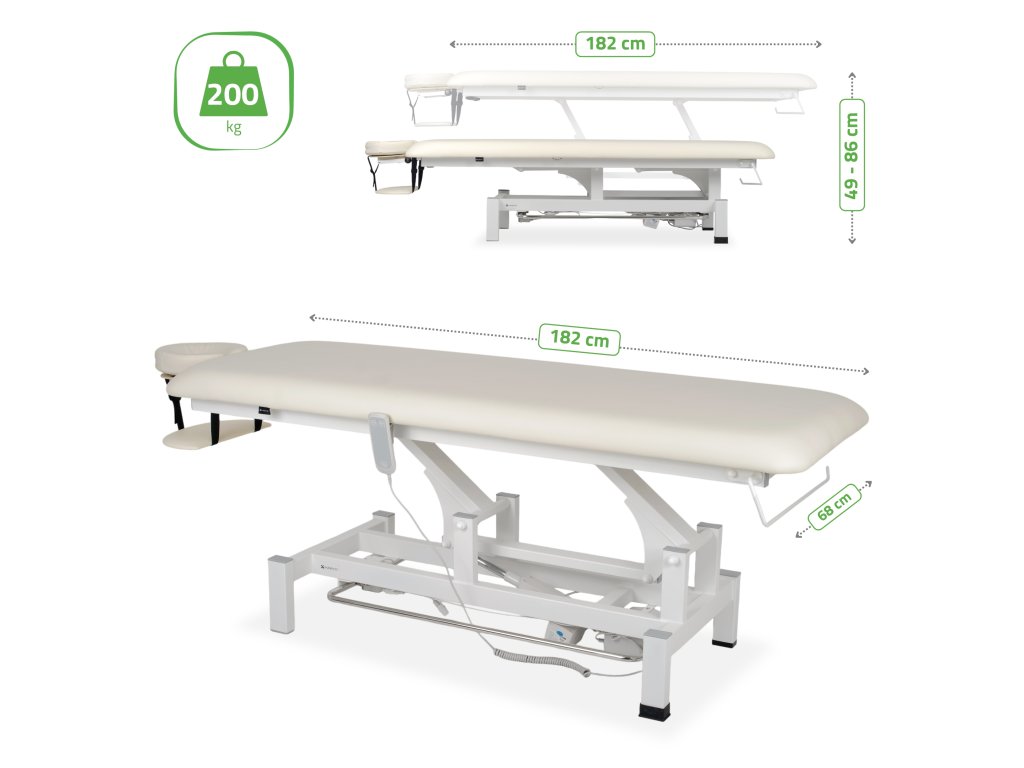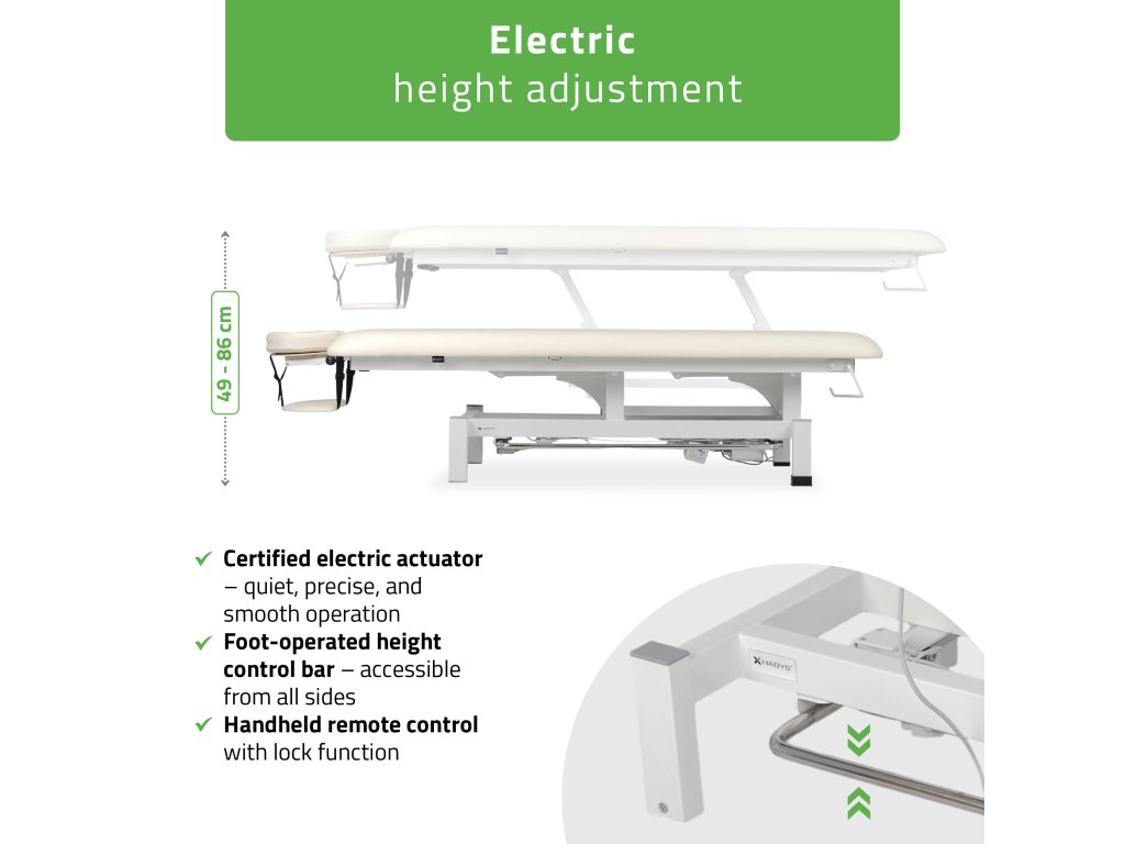 A csendes elektromos motor lehetővé teszi a magasság pontos és fokozatmentes beállítását 49 és 86 cm között. A kézi vezérlő magasságzár funkcióval van ellátva, amely megakadályozza a véletlen pozícióváltoztatást, míg a kétoldali lábvezérlő keret lehetővé teszi a kényelmes, folyamatos munkát anélkül, hogy a terapeuta megszakítaná a kezelést.