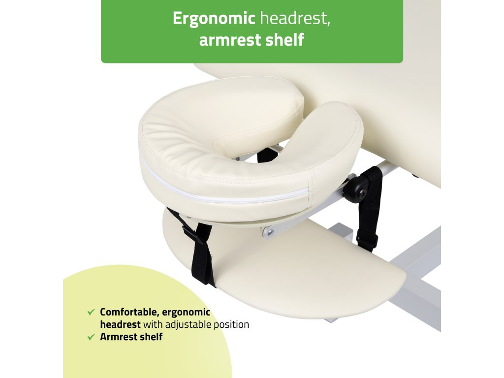 Az állítható fejtámla segítségével a páciens testhelyzete könnyen a kezelés típusához igazítható, biztosítva a maximális kényelmet hosszabb kezelések során is. A beépített kéztartó polc elősegíti a felsőtest teljes ellazulását, ami különösen fontos masszázs vagy terápiás kezelések közben.