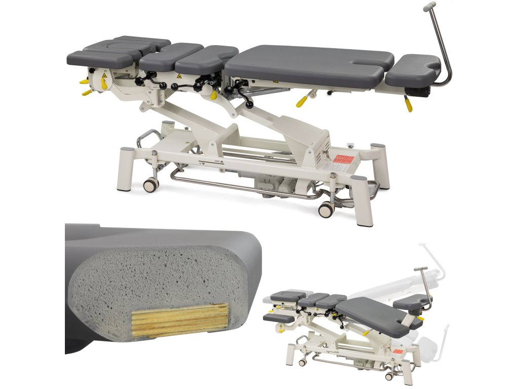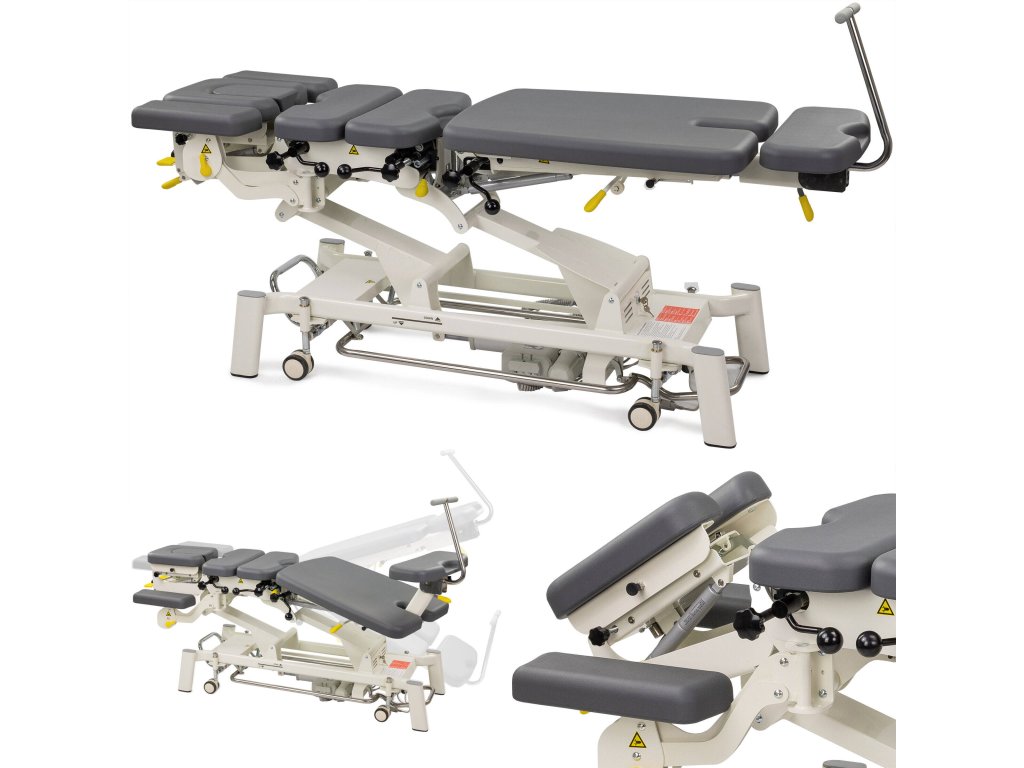 A beépített nyaki és deréktáji drop rendszer a kiropraktikai beavatkozásokhoz ideális, miközben a kartámaszok és lábtámasz állíthatóak, hogy a páciens testhelyzete mindig tökéletesen ergonomikus legyen.