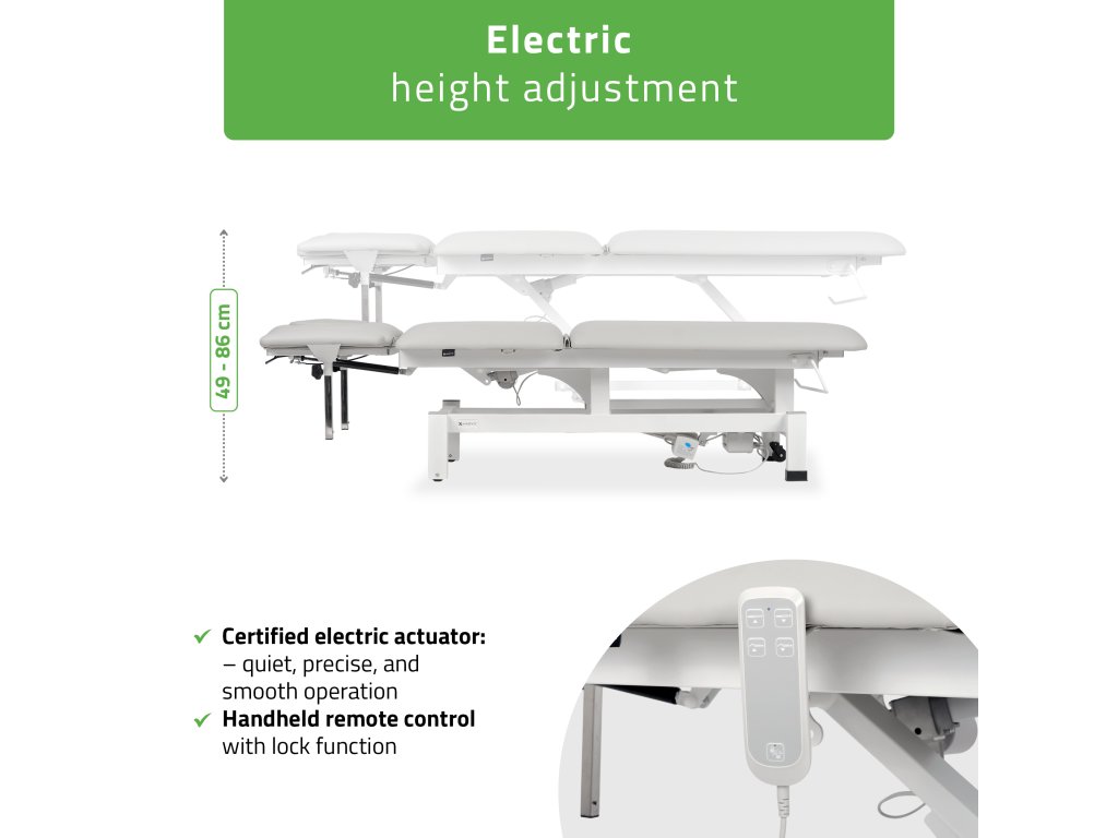 A csendes elektromos motor segítségével a magasság 49–86 cm tartományban fokozatmentesen állítható. A biztonsági zárral ellátott kézi vezérlő megakadályozza a véletlen magasságváltoztatást, így biztonságos munkakörnyezetet biztosít.