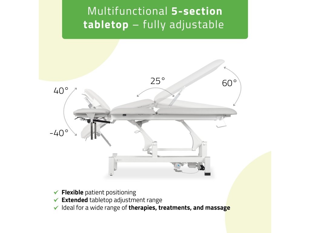 Az 5 részes fekvőfelület ergonomikus kialakítású, a középső szekció 0°–25° között dönthető, ami különösen előnyös derék- és medenceterápiák során. A fejrész –40° és +40° között állítható, arckivágással és ERGO párnával, amelyhez fedődugó is tartozik – ez garantálja a vendég kényelmét hosszabb kezelések alatt is.