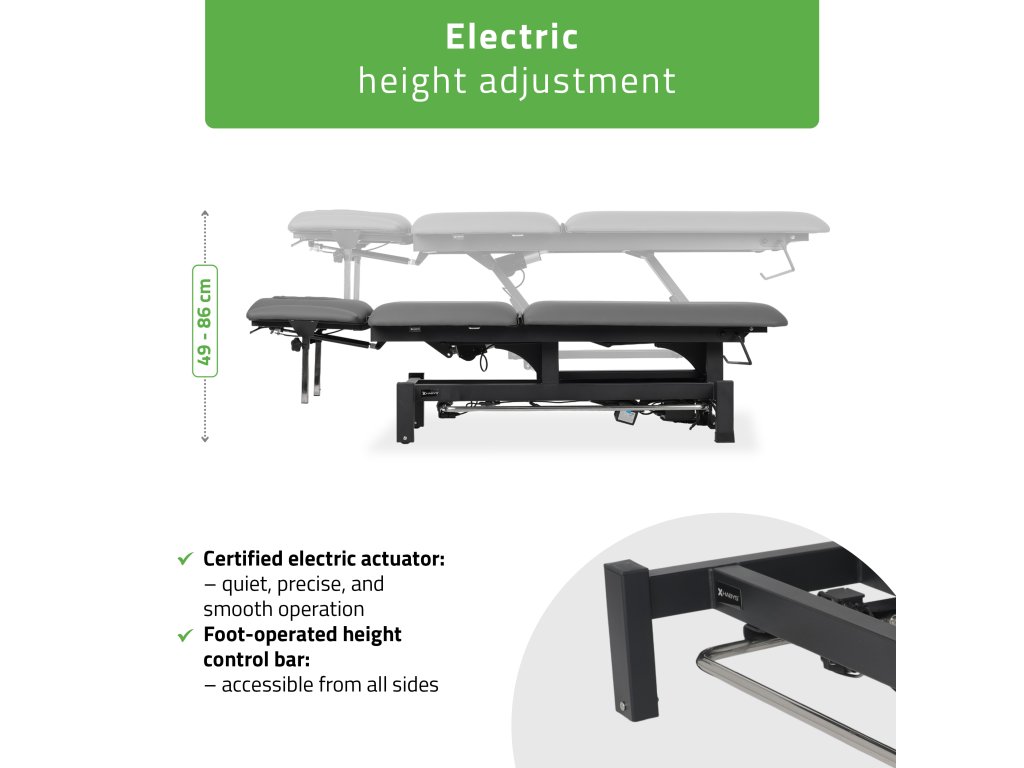 A magasság 49 és 86 cm között elektromosan állítható, kényelmesen szabályozható lábvezérlősínnel a keret körül, vagy biztonsági zárral ellátott kézi vezérlővel. A rendszer lehetővé teszi a pozícióváltást a terápia megszakítása nélkül.