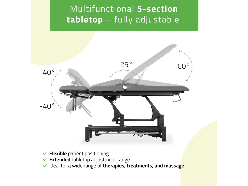 Az 5 szekciós fekvőfelület többféle pozícióban beállítható: a fejrész –40° és +40°, a középső rész 0°–25° között dönthető, így ideális derék-, medence- és rehabilitációs kezelésekhez. Az ergonomikus ERGO párna arckivágással és záródugóval gondoskodik a páciens kényelméről még hosszabb kezelések alatt is.