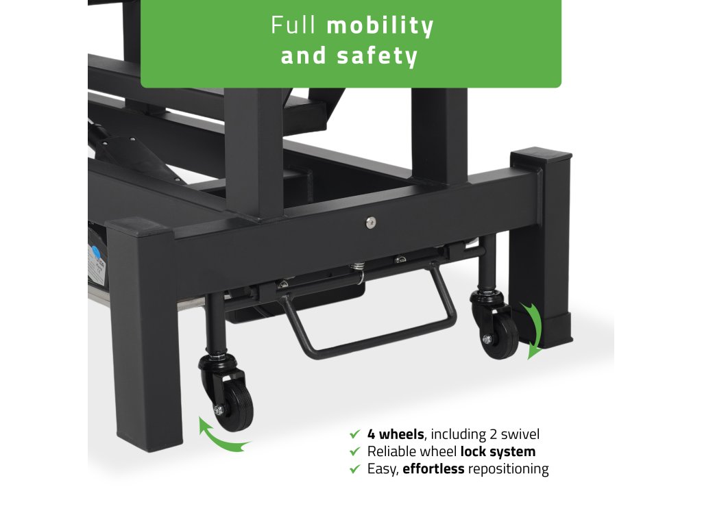 A mobil rendszer négy kerékkel (kettő forgatható, kettő fékezhető) megkönnyíti az ágy mozgatását, míg a beépített papírtekercs-tartó segít a higiénikus munkakörnyezet fenntartásában.