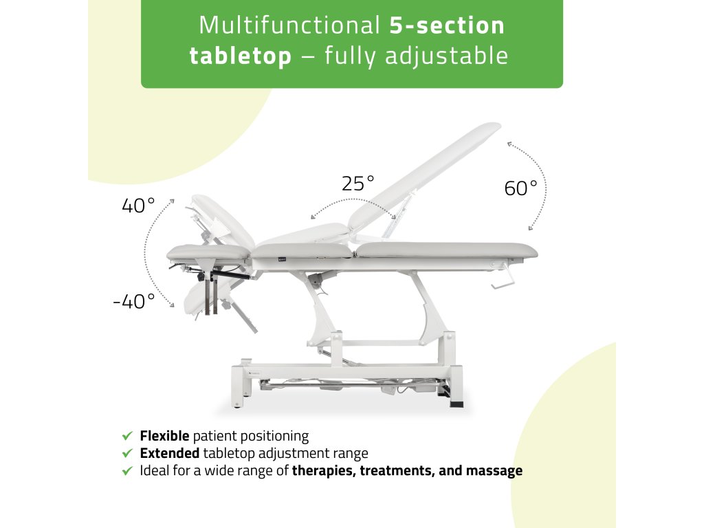 Az 5 szekciós fekvőfelület ergonomikus kialakítása lehetővé teszi a különböző testhelyzetek beállítását. A fejrész –40° és +40°, a középrész 0°–25° között állítható, így ideális derék- és medenceterápiákhoz. Az ERGO párna arckivágással és záródugóval hosszabb kezelések során is maximális kényelmet nyújt.