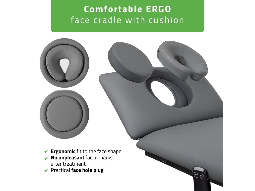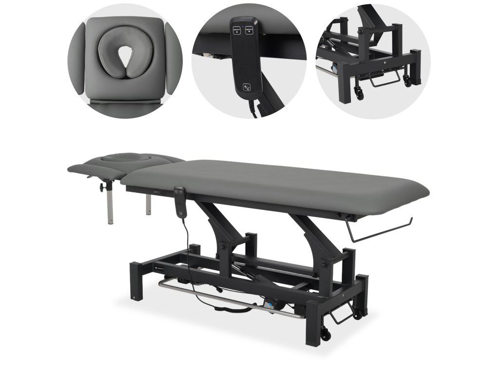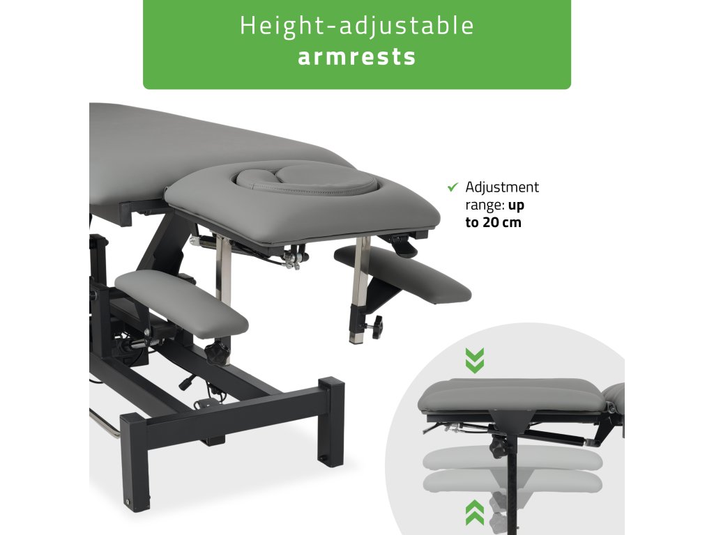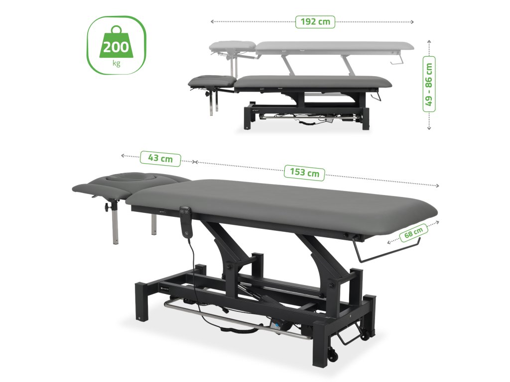 A négy részre osztott fekvőfelület (192 × 68 cm) ergonomikus kialakítású, és különböző pozíciók beállítását teszi lehetővé. A gázrugós fejtámla puha, formázott párnával és arckivágás-záró dugóval készült, így hosszabb terápiák során is kiváló kényelmet nyújt.
