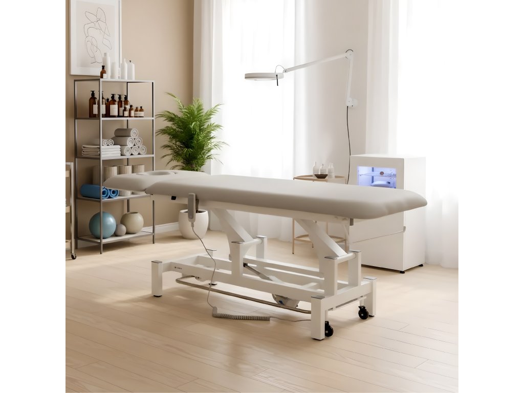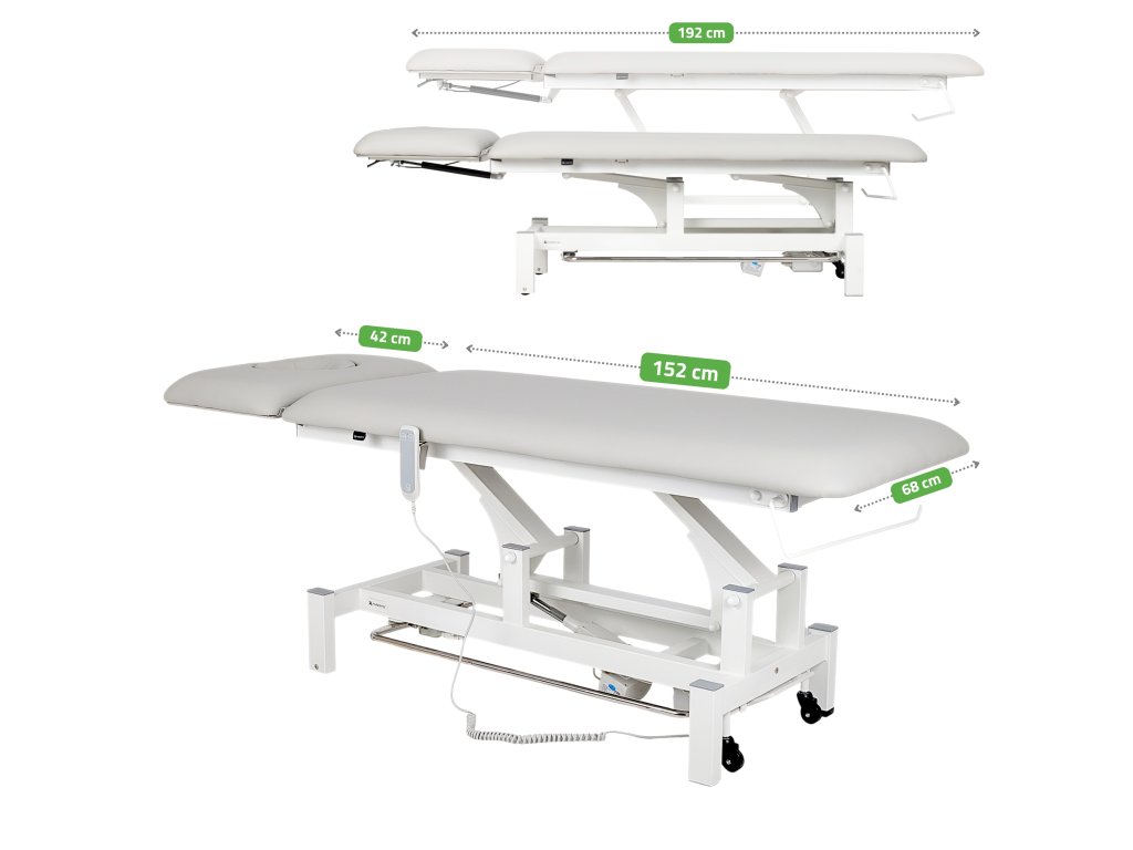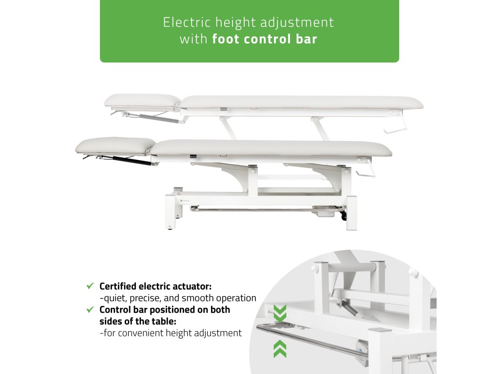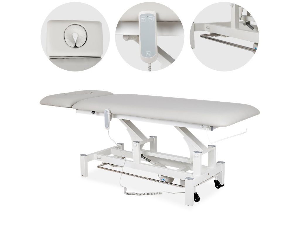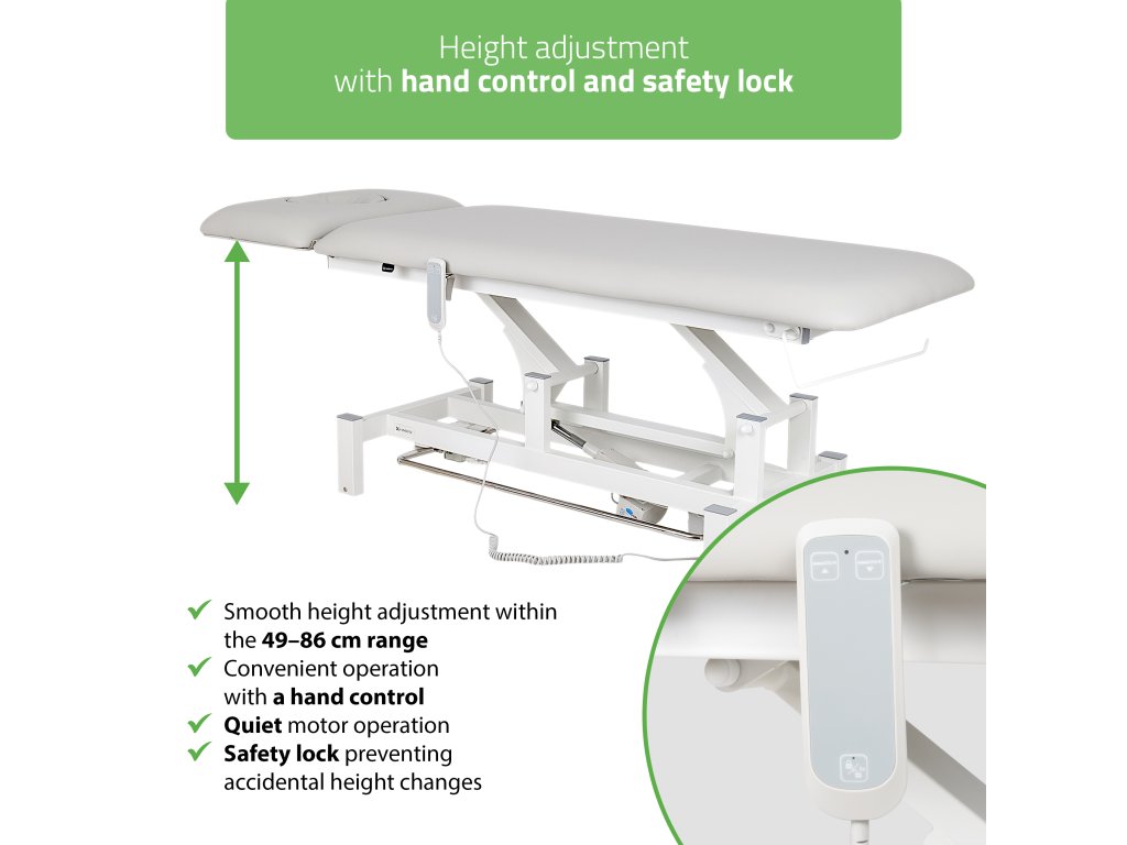A csendes elektromos motor segítségével a magasság 49–86 cm között fokozatmentesen állítható, amelyet pedálos vezérlőkerettel vagy kézi távirányítóval lehet működtetni. A két szekcióból álló kialakítás gázrugós fejrészével pontos és sima beállítást tesz lehetővé, a beépített arckivágás pedig extra kényelmet biztosít.