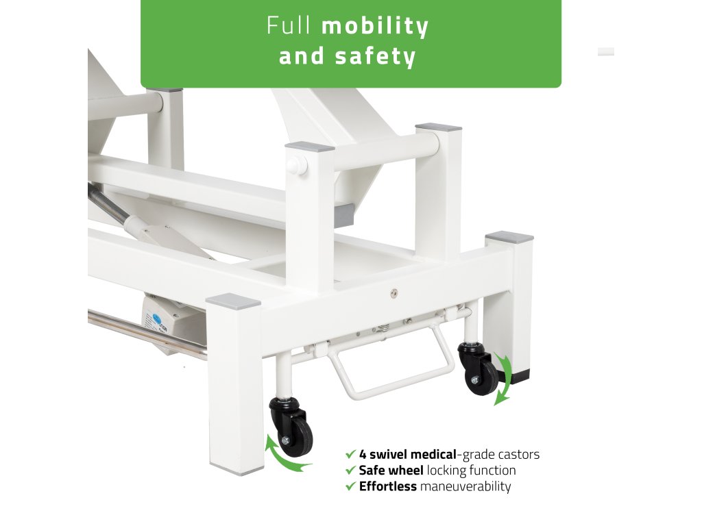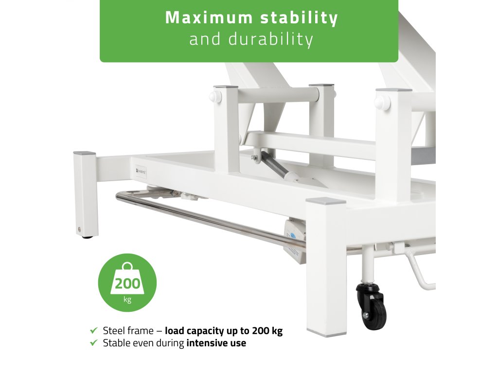A masszív acélváz 200 kg-os teherbírással, a fékezhető kerekek és a beépített papírlepedő-tartó mind hozzájárulnak a kezelőágy teljes funkcionalitásához.