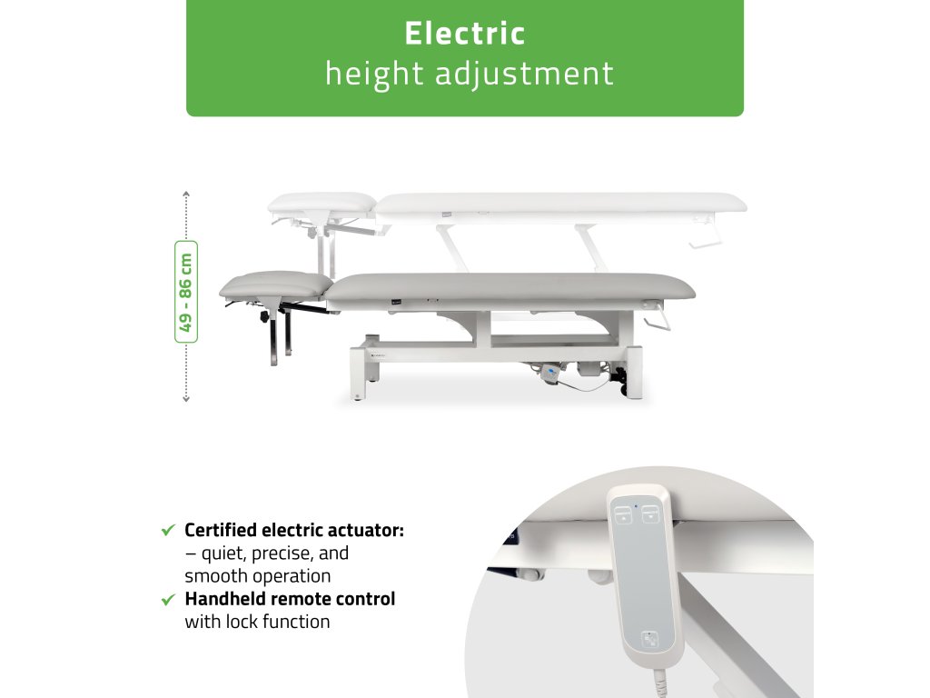 A magasság 49–86 cm között elektromosan állítható, kézi vezérlővel, amely blokkolási funkcióval rendelkezik a véletlen pozícióváltoztatás elkerülése érdekében.