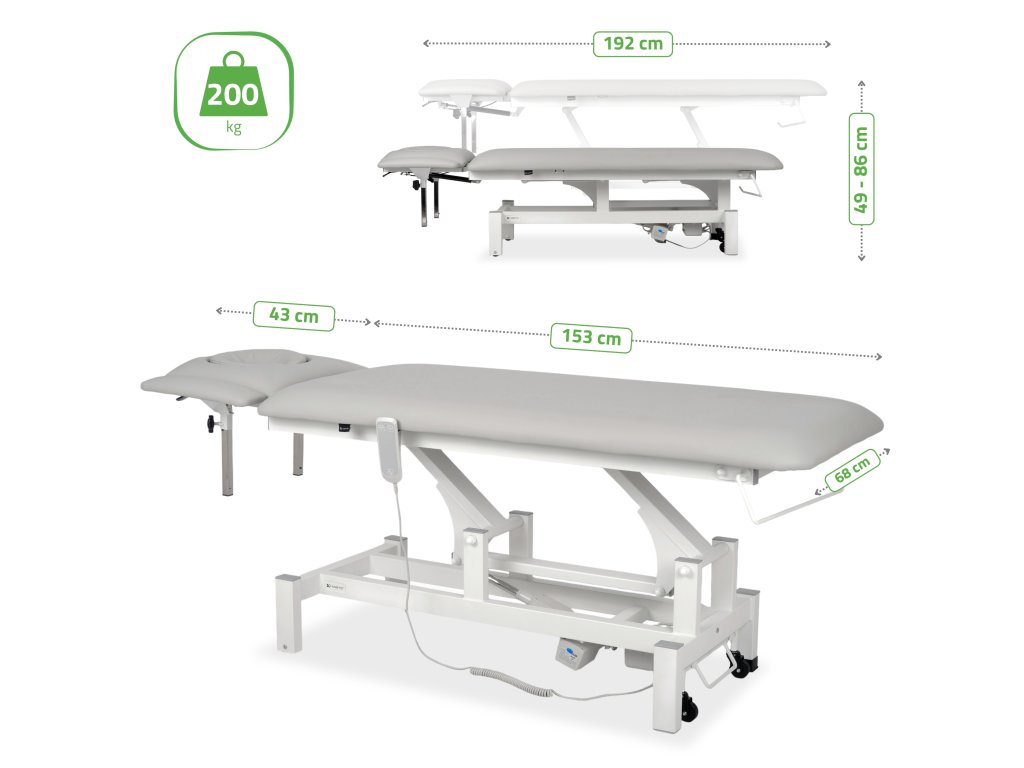 A négy szekciós fekvőfelület (192 × 68 cm) ergonomikusan formázott, gázrugós fejrészével és levehető arckivágás-betéttel maximális kényelmet biztosít. Az ERGO párna támogatja a nyak és a fej természetes pozícióját, így ideális hosszabb kezelésekhez is.