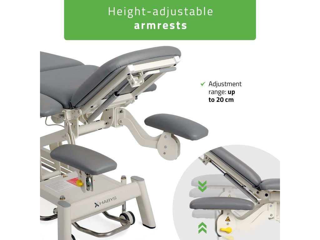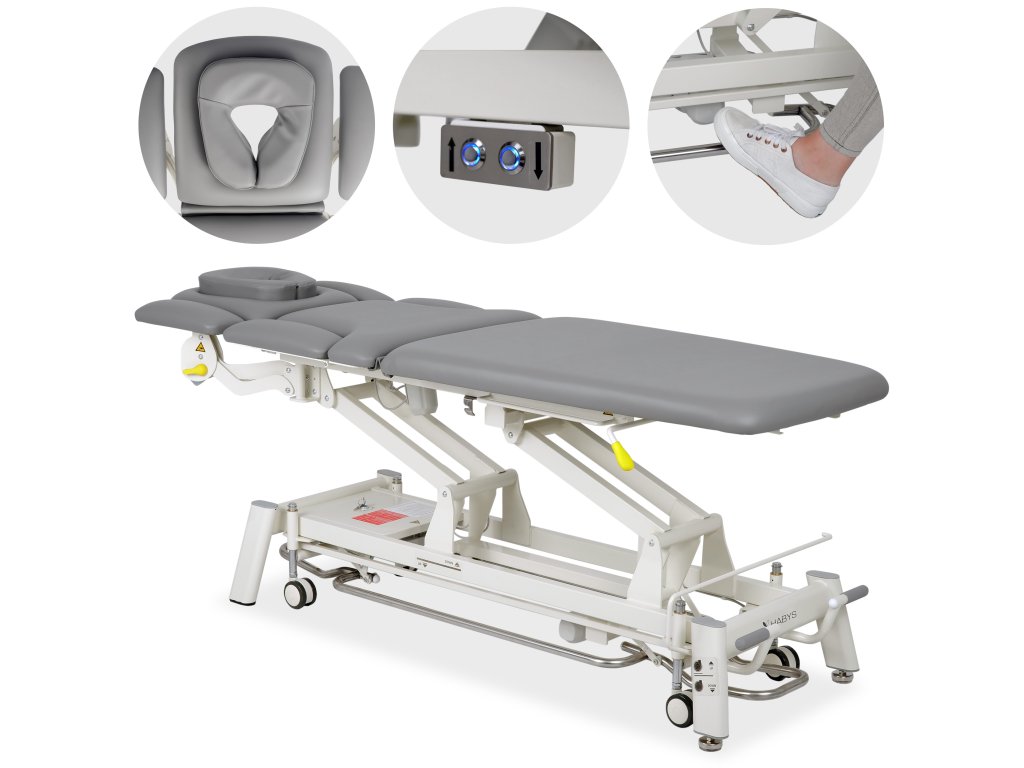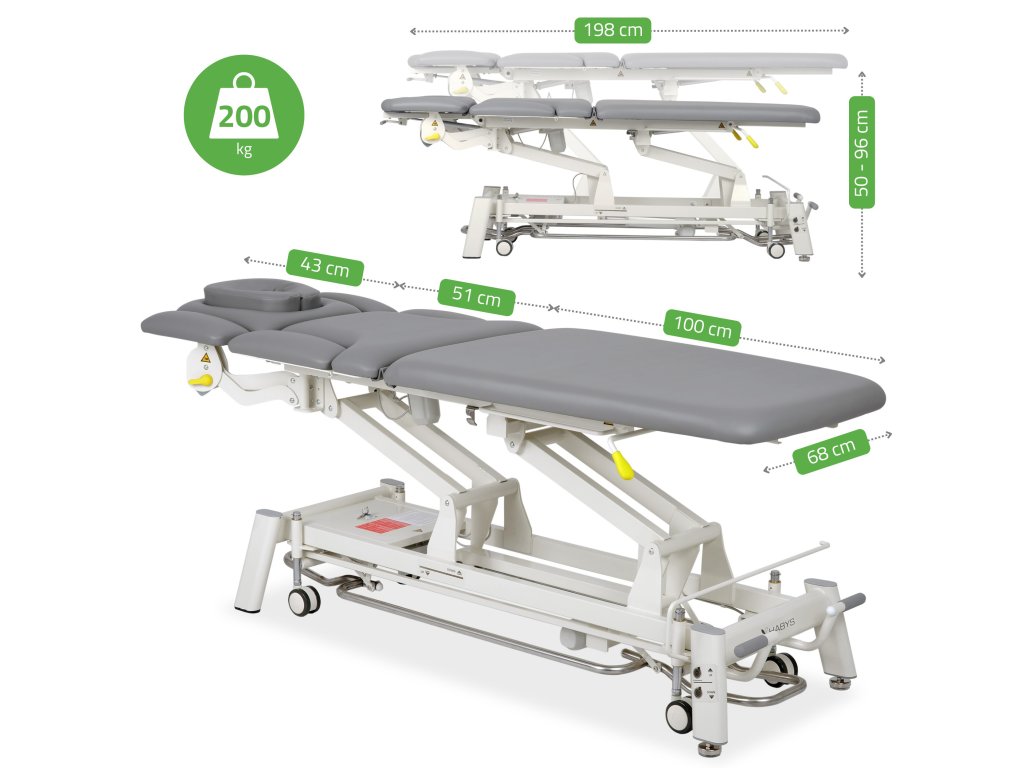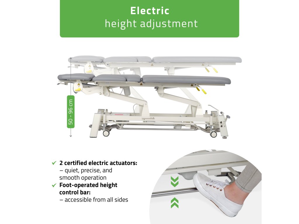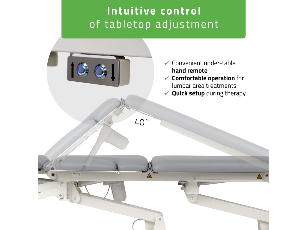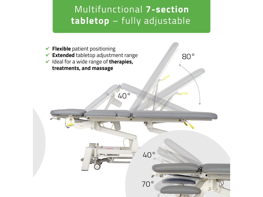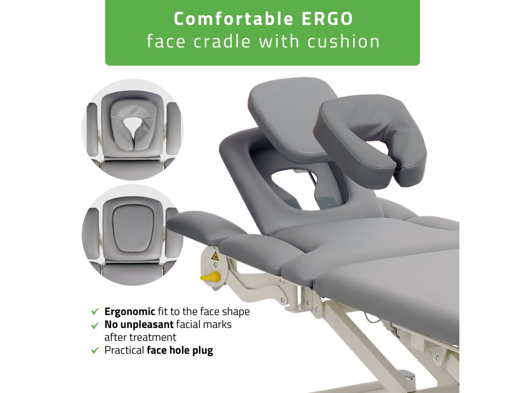 A két tanúsított motorral működő rendszer lehetővé teszi a magasság finom és halk beállítását 50 és 96 cm között, ezzel kímélve a terapeuta gerincét. A fejrész -70° és +40° között dönthető, arckivágással és kényelmes párnával – így a vendég hason és háton fekve is komfortosan elhelyezkedhet.