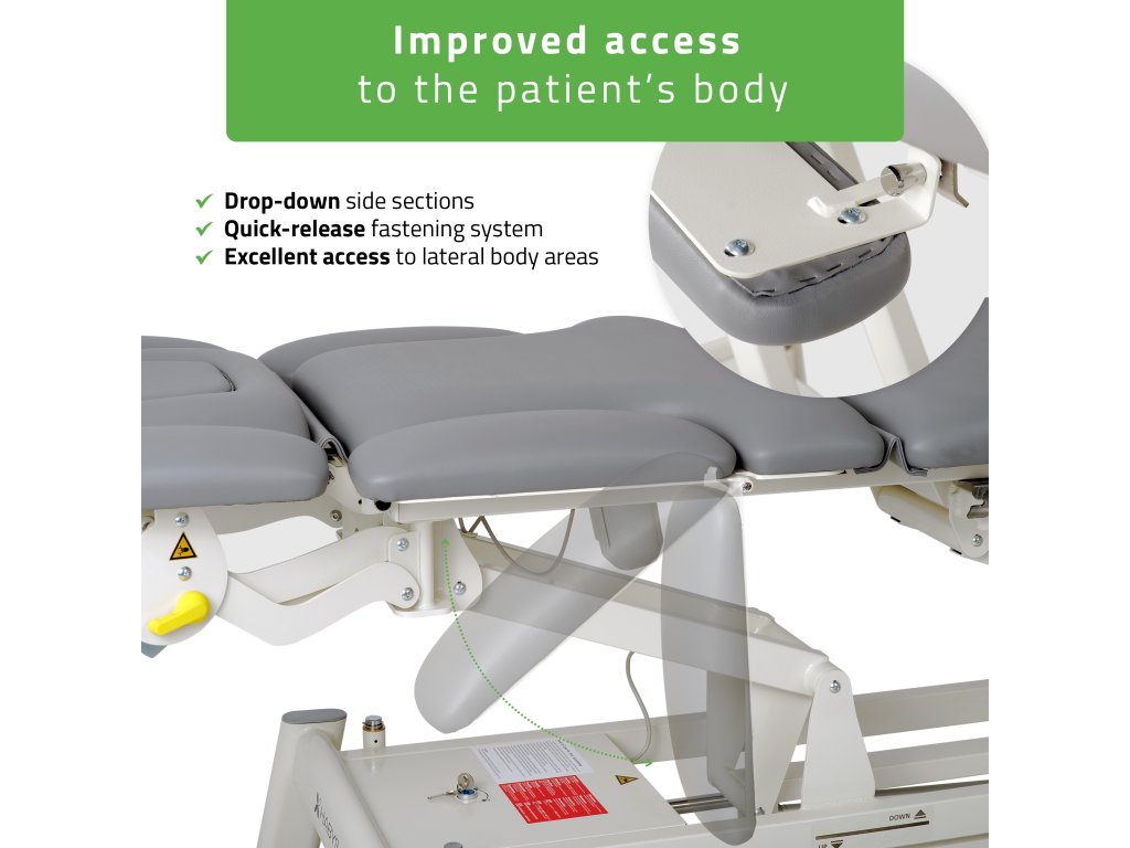 A levehető oldalsó szegmensek páratlan hozzáférést biztosítanak a test középső régióihoz – tökéletes választás fasciakezelésekhez, bordaterápiához vagy manuálterápiás technikákhoz. A pozíciók beállítása egyszerűen történik a kezelőpanel segítségével, amelyet közvetlenül az ágyfelület alatt helyeztek el – így nincs szükség a kezelés megszakítására.