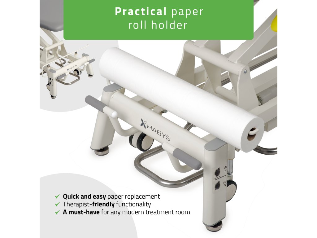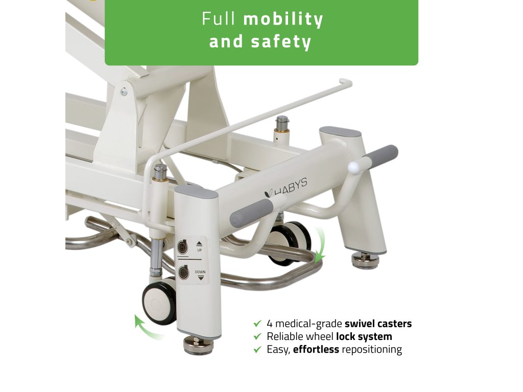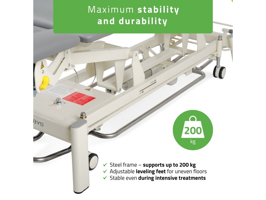 A stabil acélváz 200 kg teherbírással rendelkezik, állítható kiegyenlítő lábakkal a biztonságos elhelyezéshez. A beépített fékezhető görgők megkönnyítik az ágy mozgatását, a beépített papírtartó pedig elősegíti a higiénikus munkakörnyezet fenntartását.