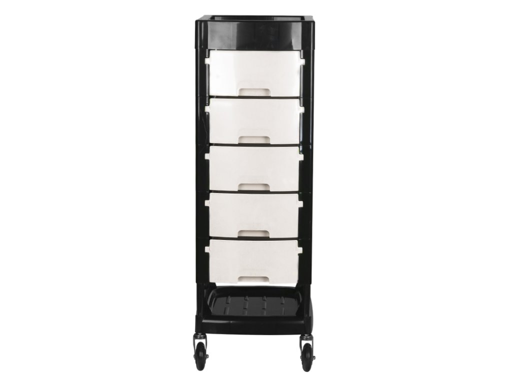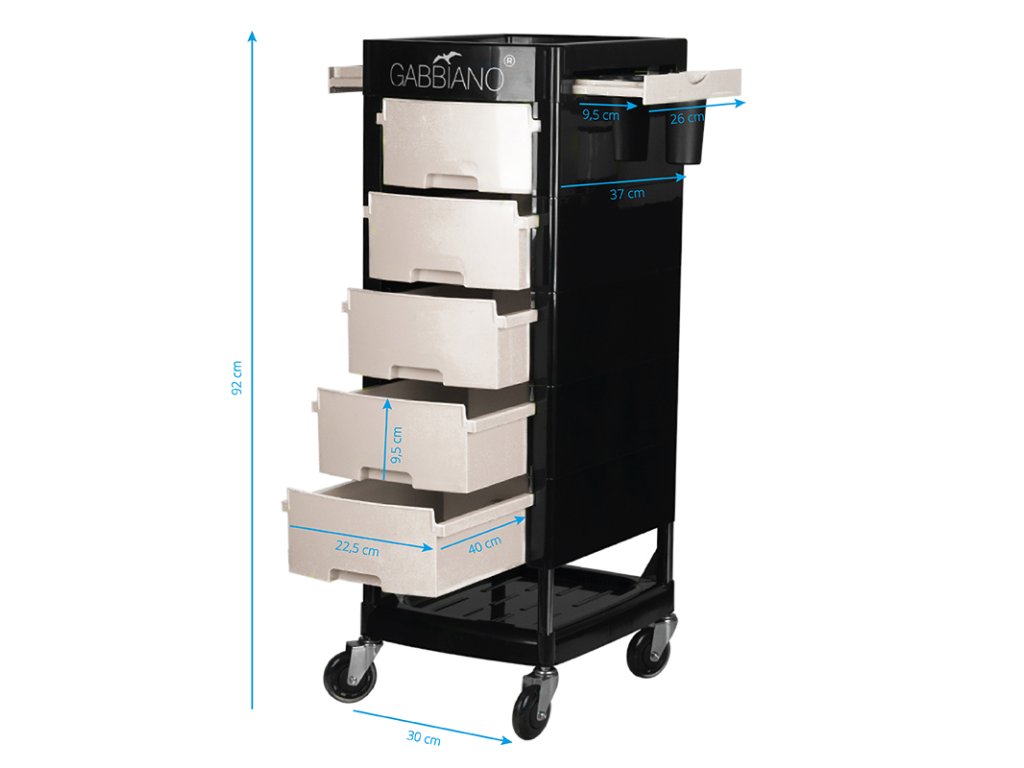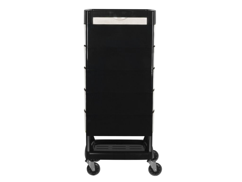 Ez a modell letisztult fekete-fehér színkombinációval készül, amely bármely klasszikus vagy modern szalonbelsőhöz elegánsan illeszkedik. A kocsi több tárolórekeszt biztosít az ollók, fésűk, hajformázó eszközök és styling termékek rendszerezett és könnyen elérhető tárolására.