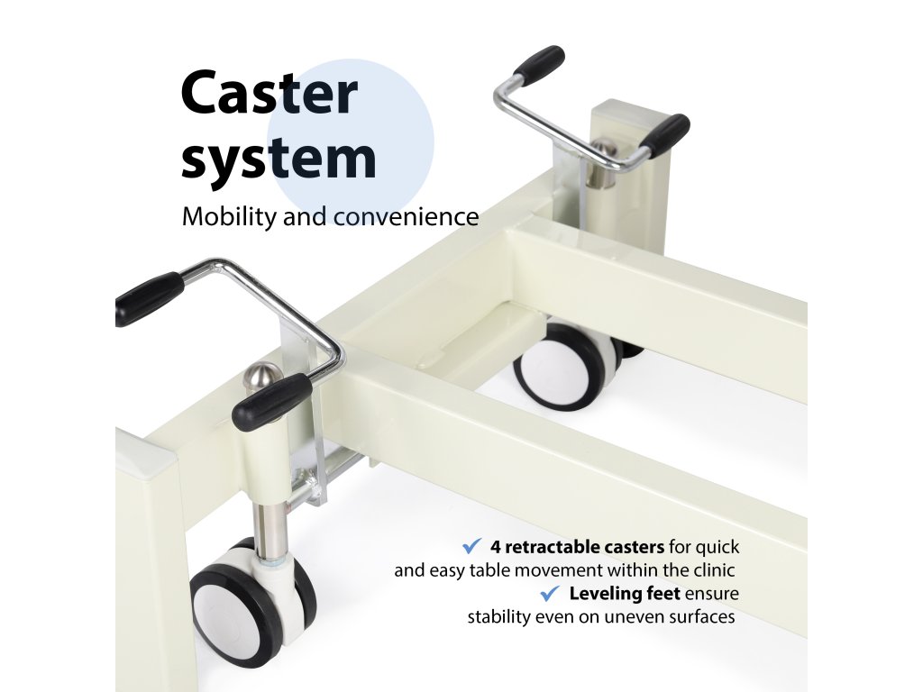 Mozgathatóság: kerekek + állítható stabilizáló lábak