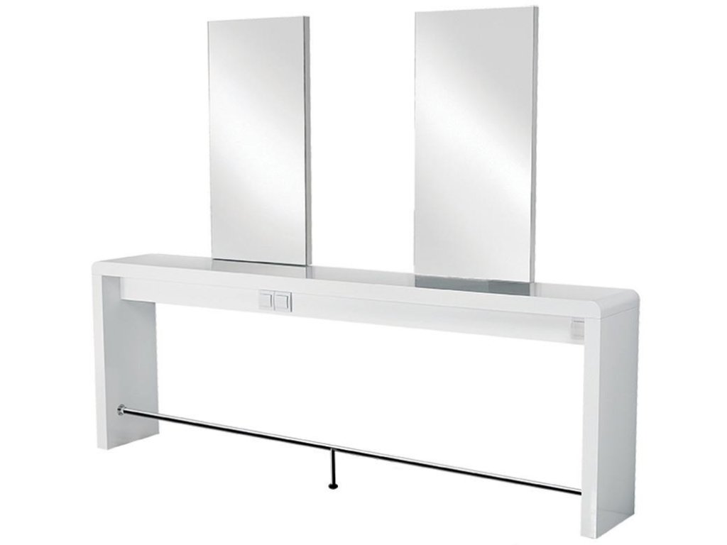 Az AYALA Reflection I fodrász fal rozsdamentes acél lábtartóval és két elektromos aljzattal (fehér vagy fekete színben) van felszerelve, amelyek biztosítják a kényelmes használatot. Az acél szerelősíneknek köszönhetően a telepítés biztonságos és stabil.