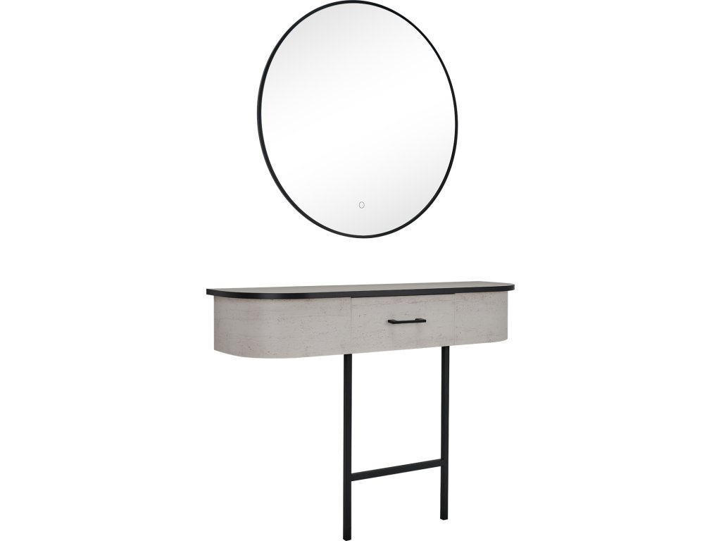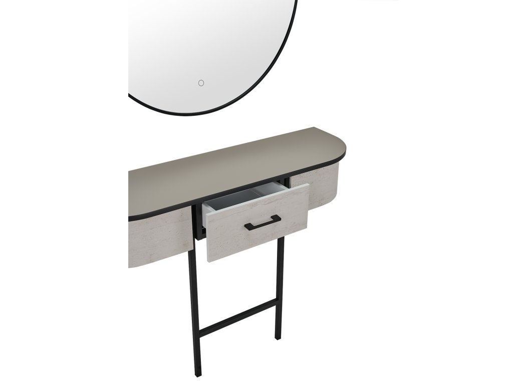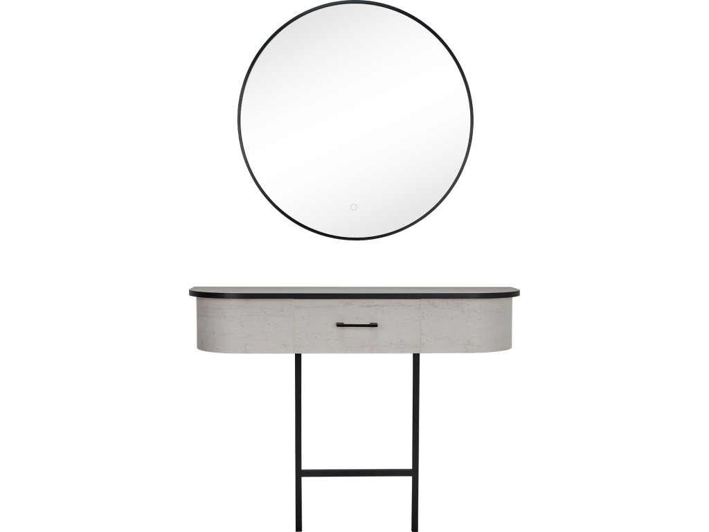 A koncepció központi eleme a 80 cm átmérőjű, LED világítással ellátott kerek tükör, amelyet választott színű munkalap és a strukturált keret harmonikus kombinációja egészít ki. Az elegáns kialakítást a LED-del megvilágított előlap és a fekete vagy arany színű lábakba integrált lábtartó teszi teljessé.