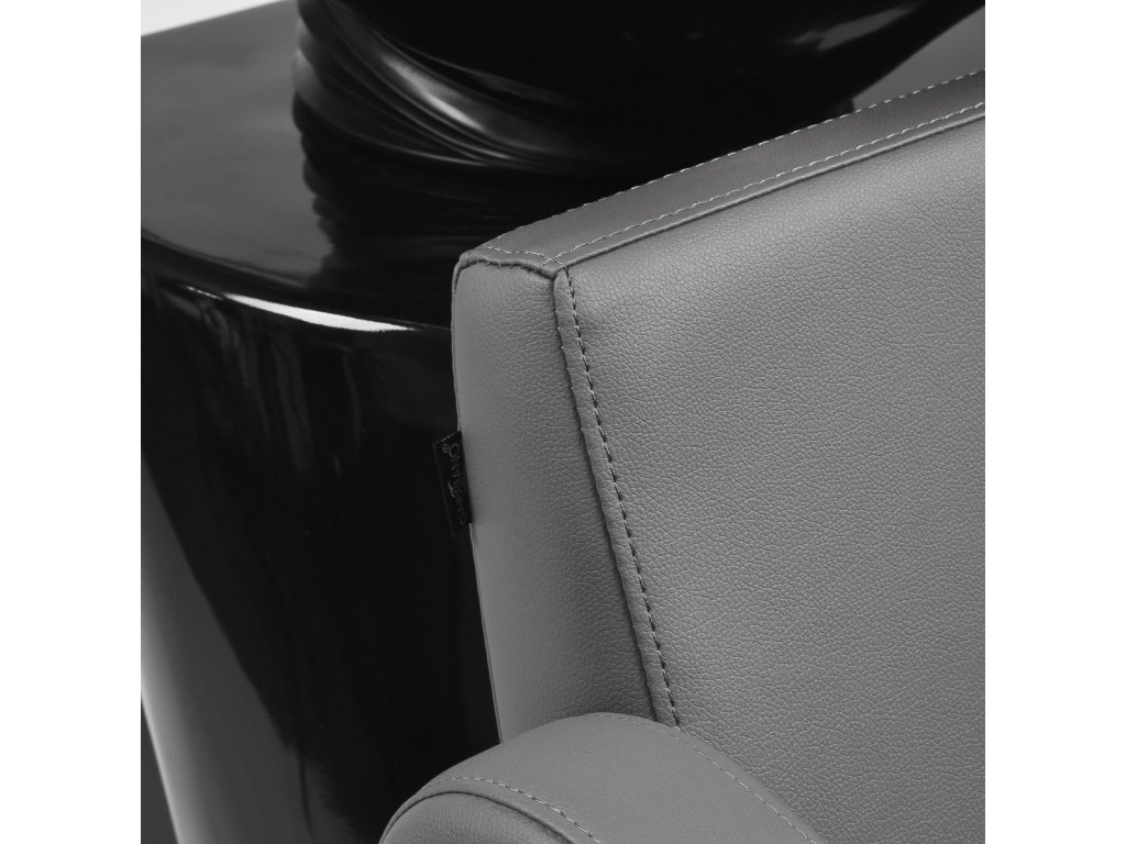 Az ülőrész ergonomikus kialakítású, hogy maximális kényelmet nyújtson a vendég számára. A puha fejtámasz növeli a komfortérzetet és kiküszöböli a hideg kerámia érzetét. A szürke árnyalatú, szintetikus bőr kárpit elegáns, kopásálló és könnyen tisztítható, így ideális a mindennapi szalonhasználathoz.