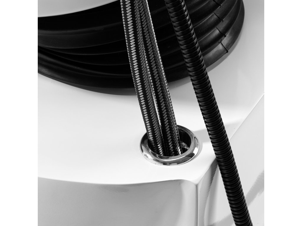 A Porto modell teljes fekete armatúrával van felszerelve – keverőcsap, zuhanyfej és csatlakozó tömlők – minden egyben biztosítva a professzionális működést. A vízbekötés rejtetten helyezkedik el az alapban, amely elegáns, letisztult megjelenést eredményez. Az ülőfelület és a háttámla közötti nyílás megkönnyíti a tisztítást és a haj gyors eltávolítását.