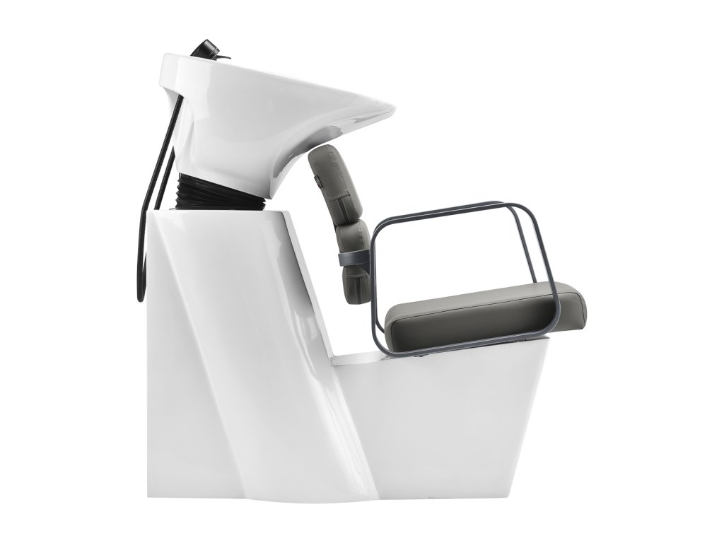 A modell központi eleme a fehér kerámia mosdótál, amely ellenáll a sérüléseknek, a foltoknak és a karcolásoknak. Állítható dőlésszöge lehetővé teszi a személyre szabott beállítást a vendég és a fodrász igényei szerint. A kényelmet tovább növeli a fekete nyaktámasz, amely megszünteti a kerámia hideg érzetét.
