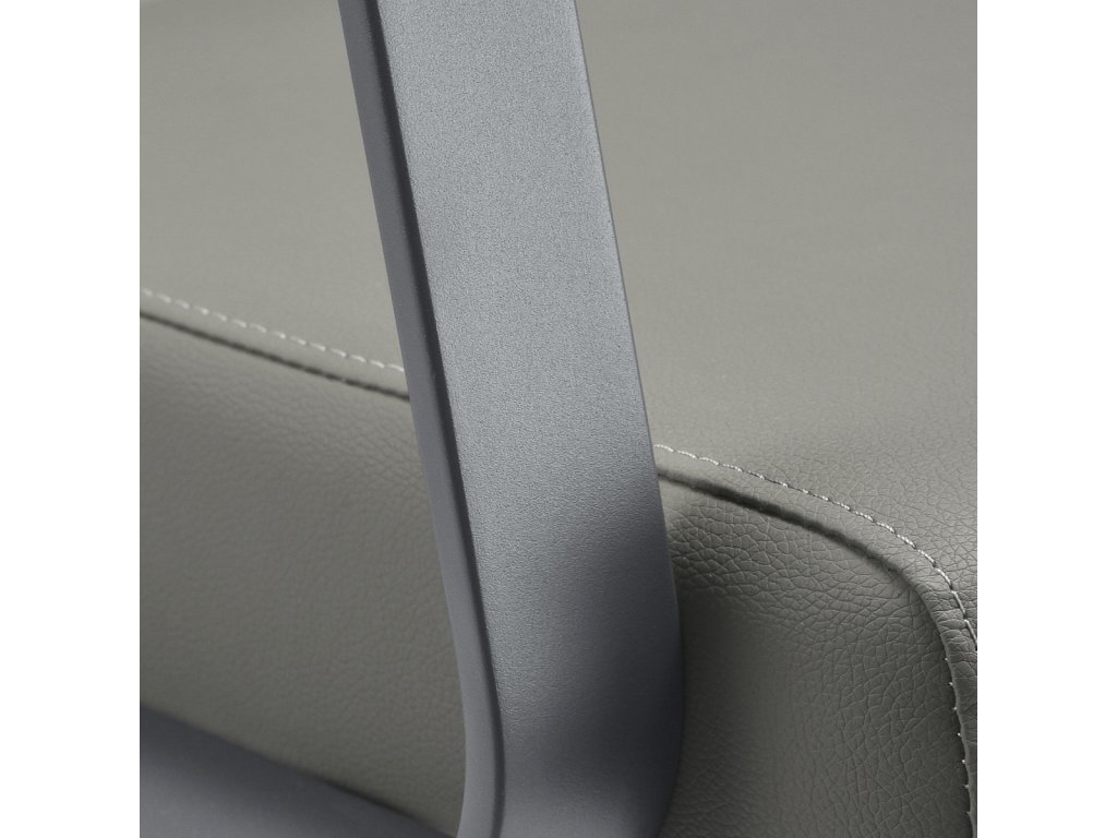 Az ülőrész ergonomikus kialakítású, tartós szürke szintetikus bőrrel kárpitozott. Ez az anyag elegáns, könnyen tisztítható, nedvességálló, és a kiváló minőségű szivacstöltet hosszú élettartamot biztosít deformáció nélkül. A szürke árnyalatú fém kartámaszok támogatják a helyes testtartást és emelik a teljes komfortérzetet.