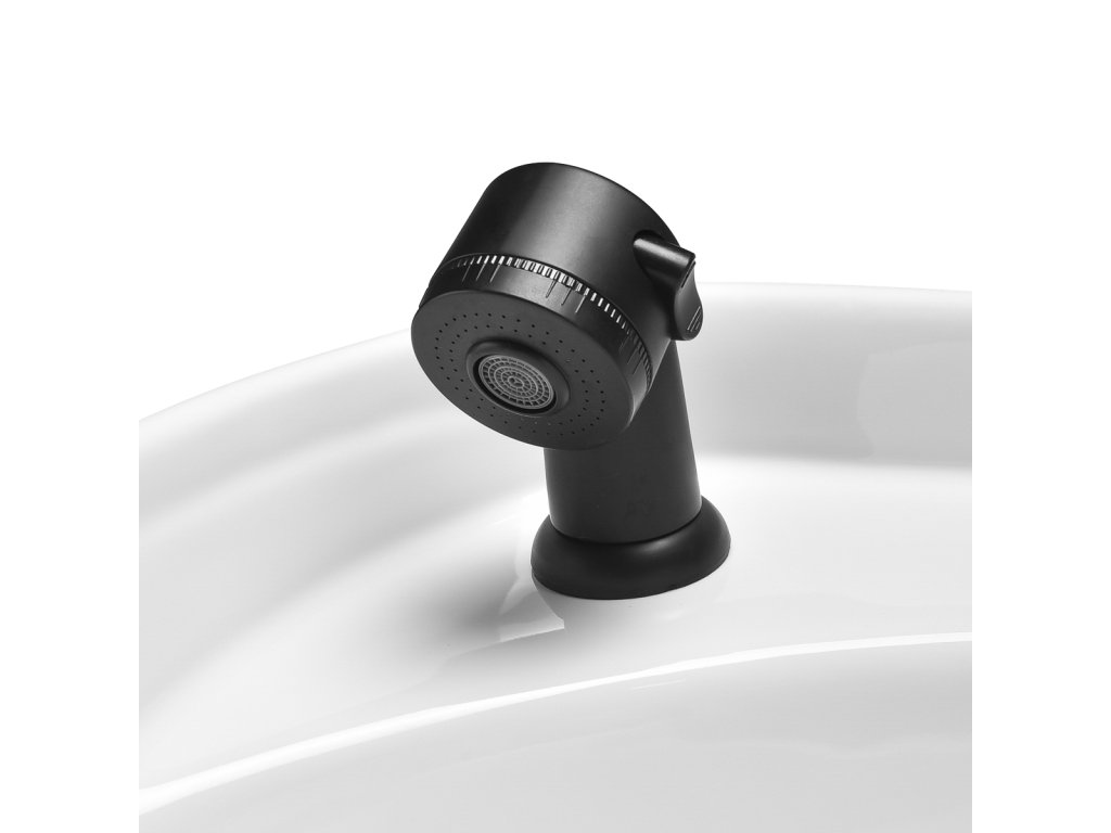 A teljes fekete armatúra – keverőcsap, zuhanyfej és csatlakozó tömlők – része a csomagnak. A vízcsatlakozás rejtve van az alapban, így a dizájn letisztult és professzionális hatást kelt. Külön praktikus megoldás a nyílás az ülőfelület és a háttámla között, amely lehetővé teszi a gyors és higiénikus tisztítást.