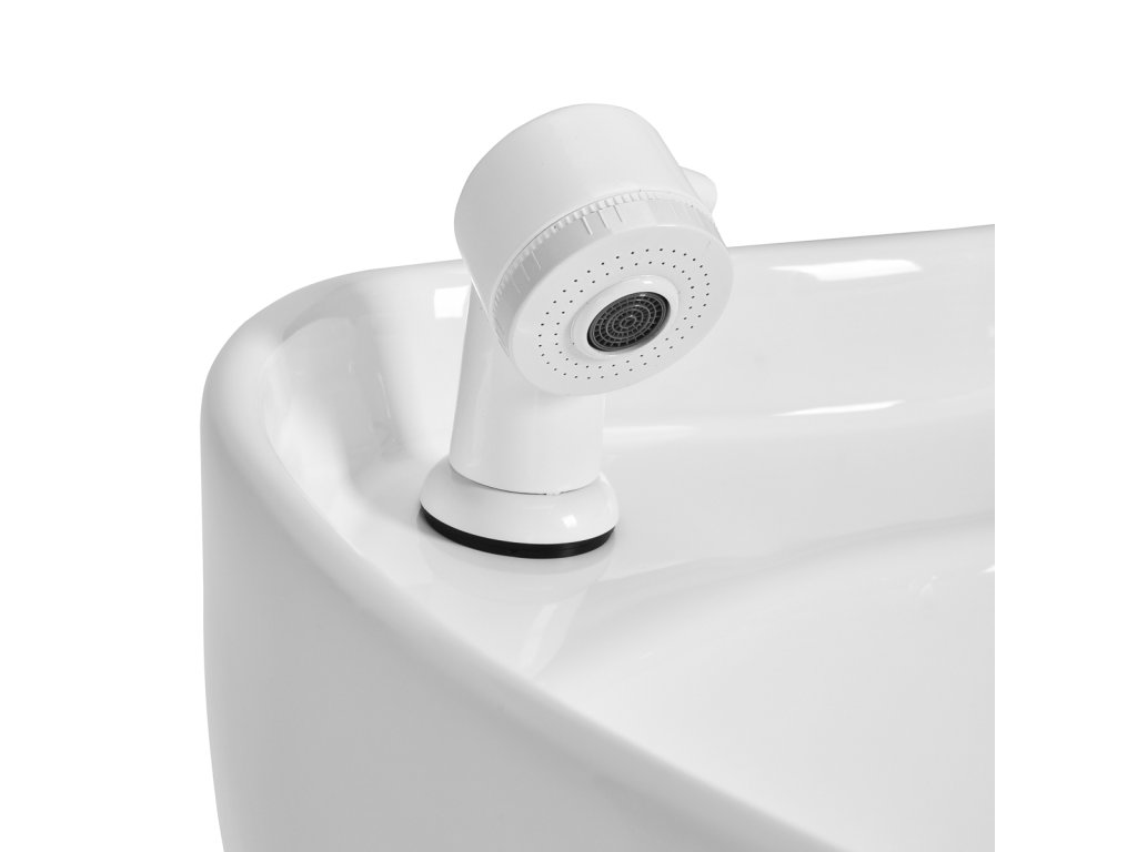 A készlet tartalmazza a teljes fehér design csaptelepet – kartusos csap, zuhanyfej, tömlő, tartó és leeresztő szelep szűrővel, amely segít fenntartani a magas higiéniai szintet. A vízellátás rejtett a talapzatban, így tiszta és profi megjelenést biztosít.