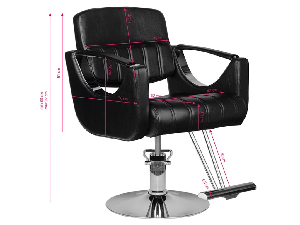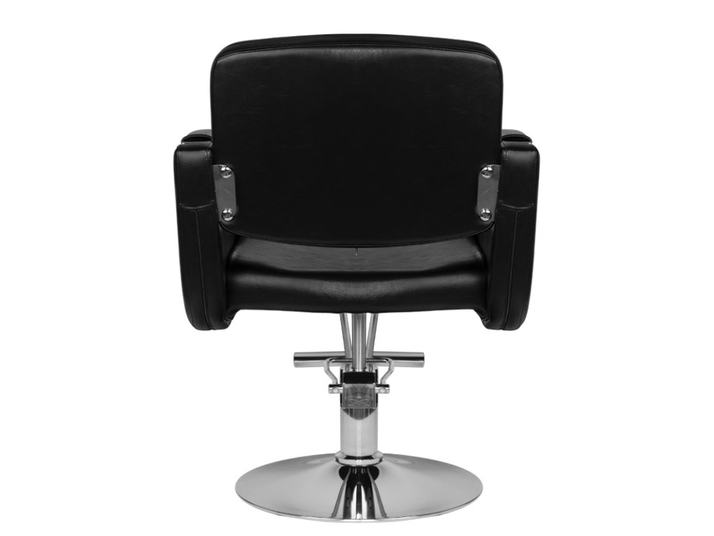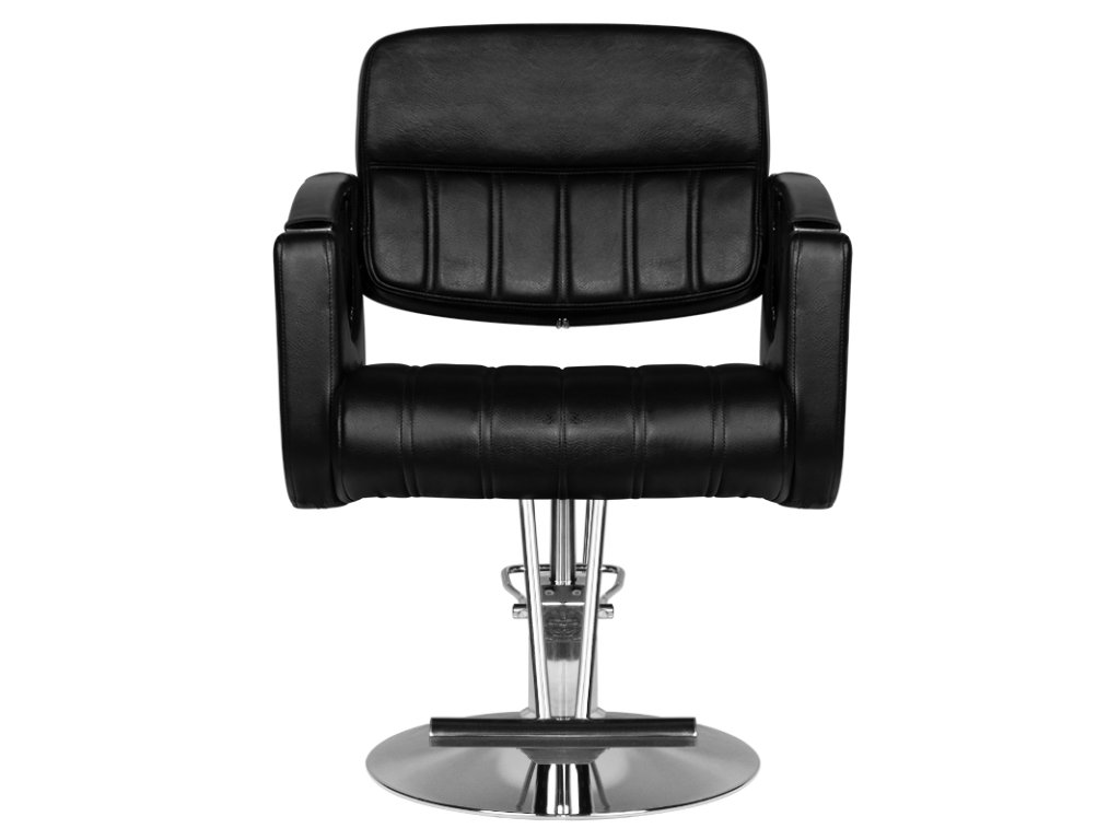 Modern fodrász szék a HAIR SYSTEM-től. Elegáns és nagyon kényelmes. A masszív krómozott talapzat garantálja az ülés stabilitását. A kárpitozás kiváló minőségű fekete öko-bőrből készült. A szék felfelé és lefelé állítható