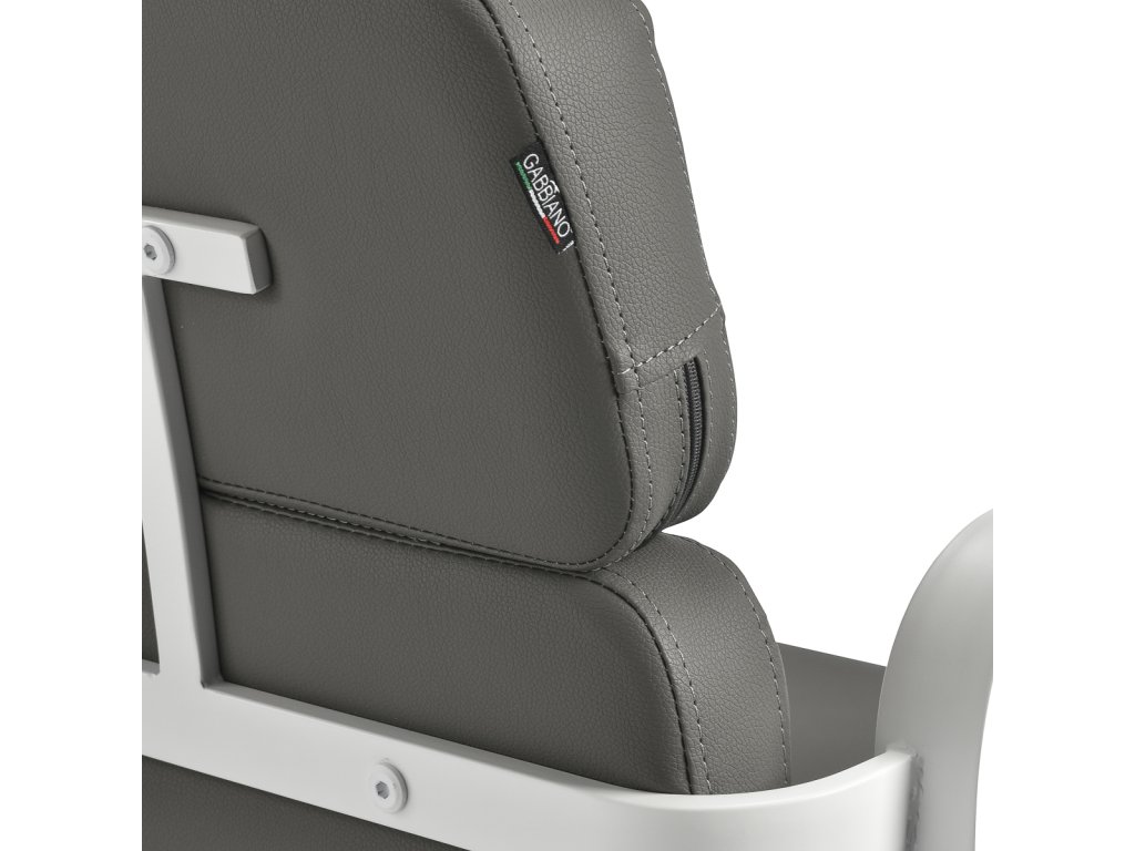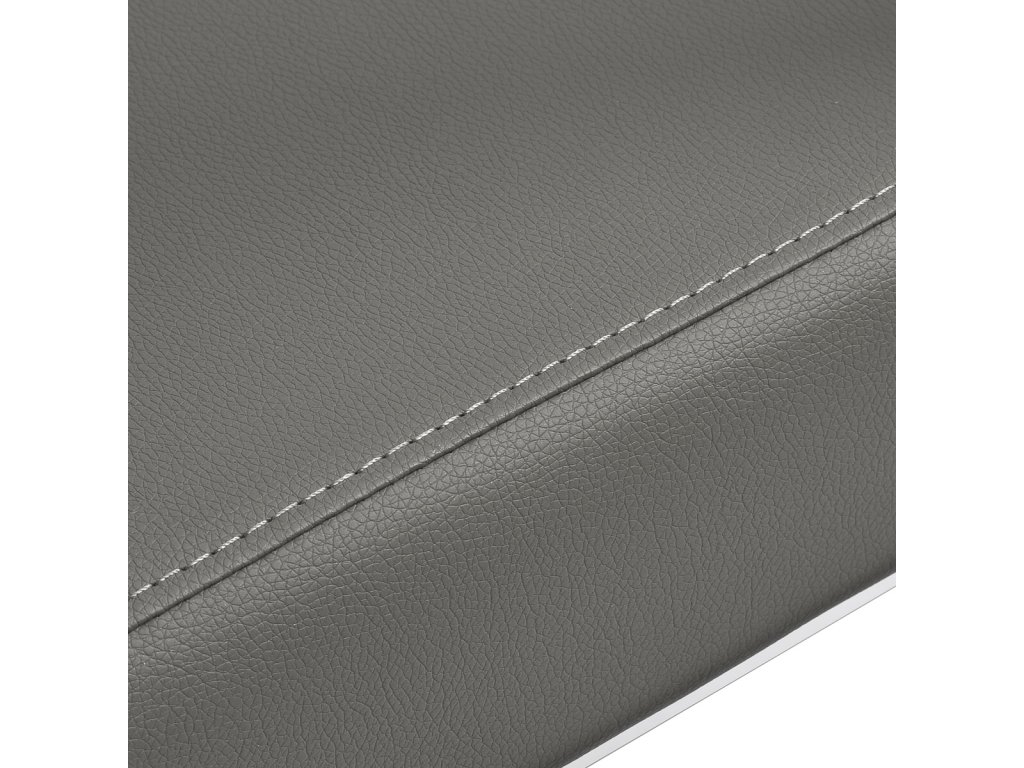 A szürke kárpitozás minőségi műbőrből készült, kellemes tapintású, vízálló és könnyen tisztítható. A stabil habbetét hosszú távú komfortot és formastabilitást garantál. A fehér fém karfák kényelmes ülést biztosítanak, és a stílusos lábtartóval együtt növelik a kliens komfortját.