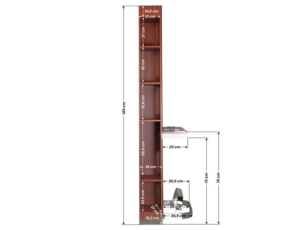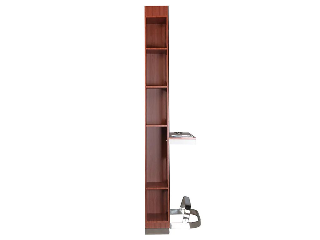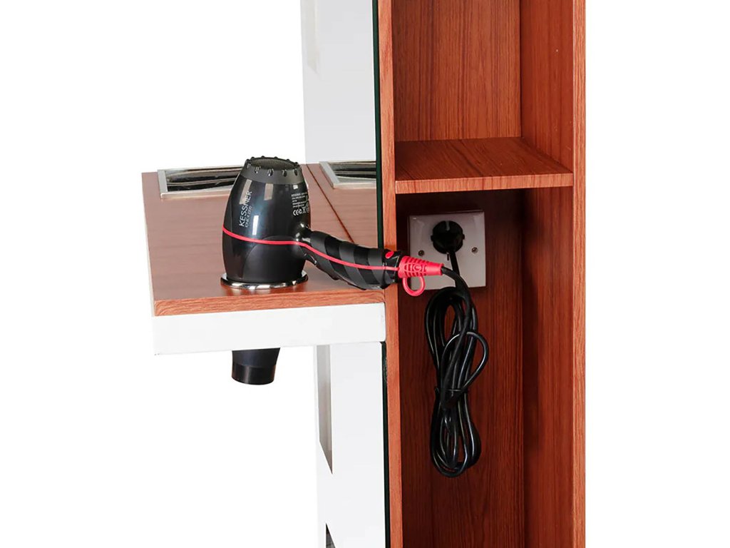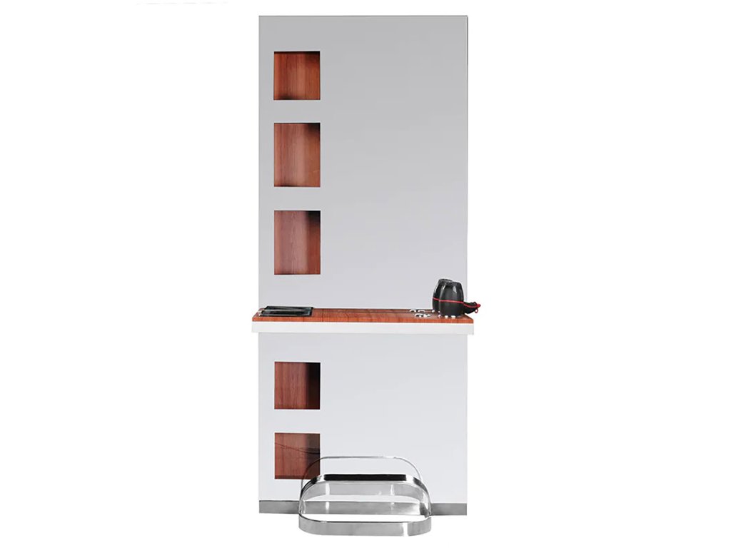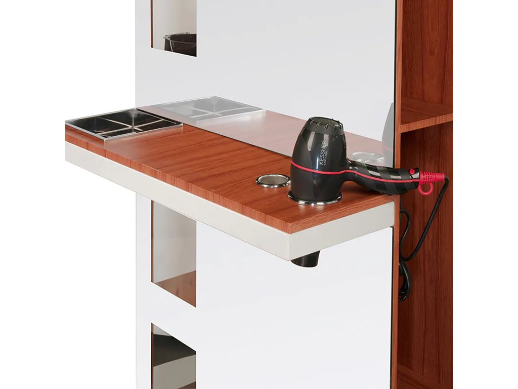Mindkét oldalon praktikus tárolópolcok kaptak helyet, amelyek lehetővé teszik a fodrász eszközök, hajápolási termékek és kiegészítők rendszerezett elhelyezését. Az egyik oldalon a polcok hátulról, a falon keresztül is átláthatók, így gyors hozzáférést biztosítanak a napi munkavégzés során. A masszív kivitel, a kiváló minőségű anyaghasználat és az elegáns fa hatású cherry szín biztosítják, hogy ez a fodrász bútor nemcsak hasznos, hanem esztétikai szempontból is kiemelkedő része legyen a szalonberendezésnek.