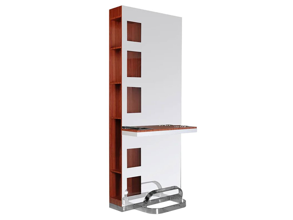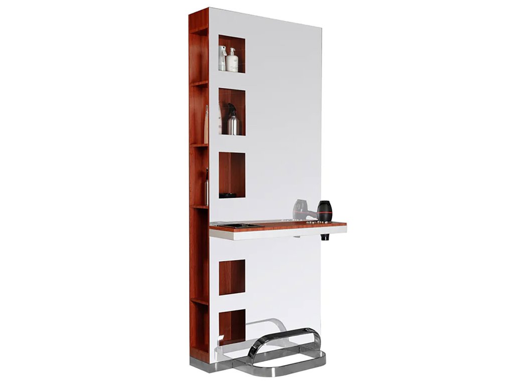 A GABBIANO B058 Cherry egy elegáns és funkcionális fodrász munkafal, amely ideális választás bármely modern fodrász szalon vagy szépségszalon berendezéséhez. Letisztult, praktikus kialakítása révén tökéletesen ötvözi a stílust és a használhatóságot. A munkafal központi eleme a nagy méretű tükör, amely nemcsak vizuálisan tágítja a teret, hanem kiválóan szolgálja a fodrászati szolgáltatásokat is, mint a hajvágás, hajformázás vagy hajfestés.